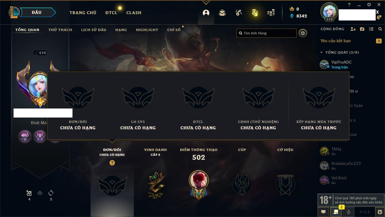 Rank Đơn: Chưa RankKhung: SắtTướng: 140 - Còn 610 THXTrang Phục: 110Rank ĐTCL: Chưa RankLinh Thú: 162