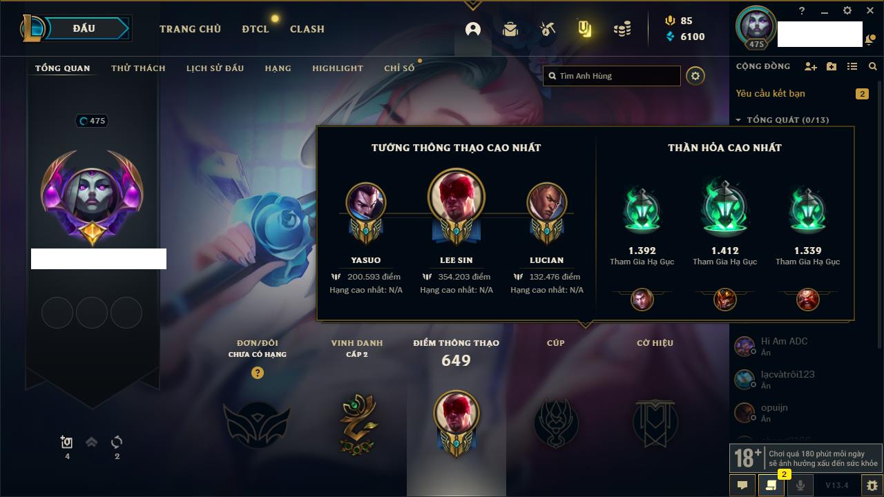 Rank Đơn: Chưa RankKhung: Bạch kimTướng: 172 - Còn 10879 THXTrang Phục: 288Rank ĐTCL: Chưa RankLinh Thú: 69