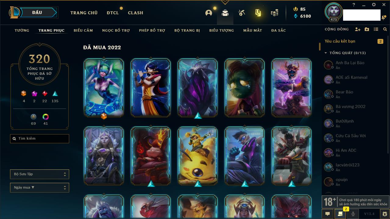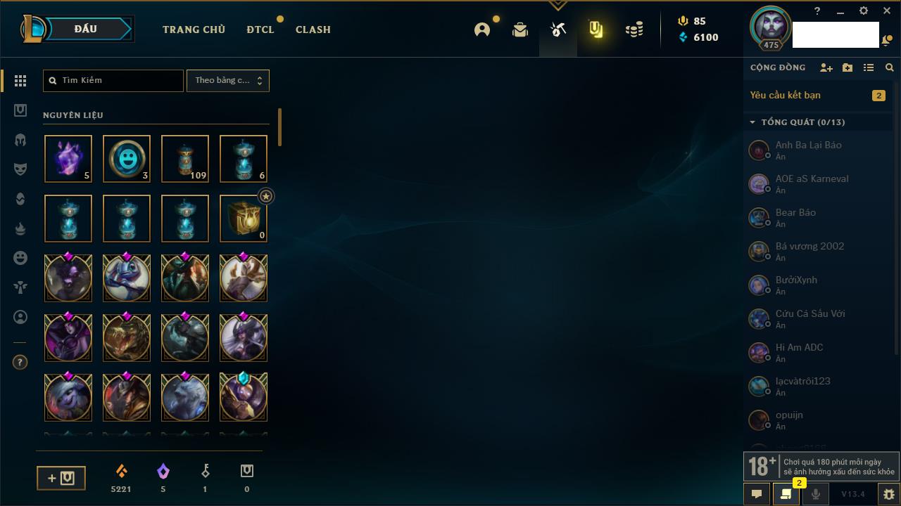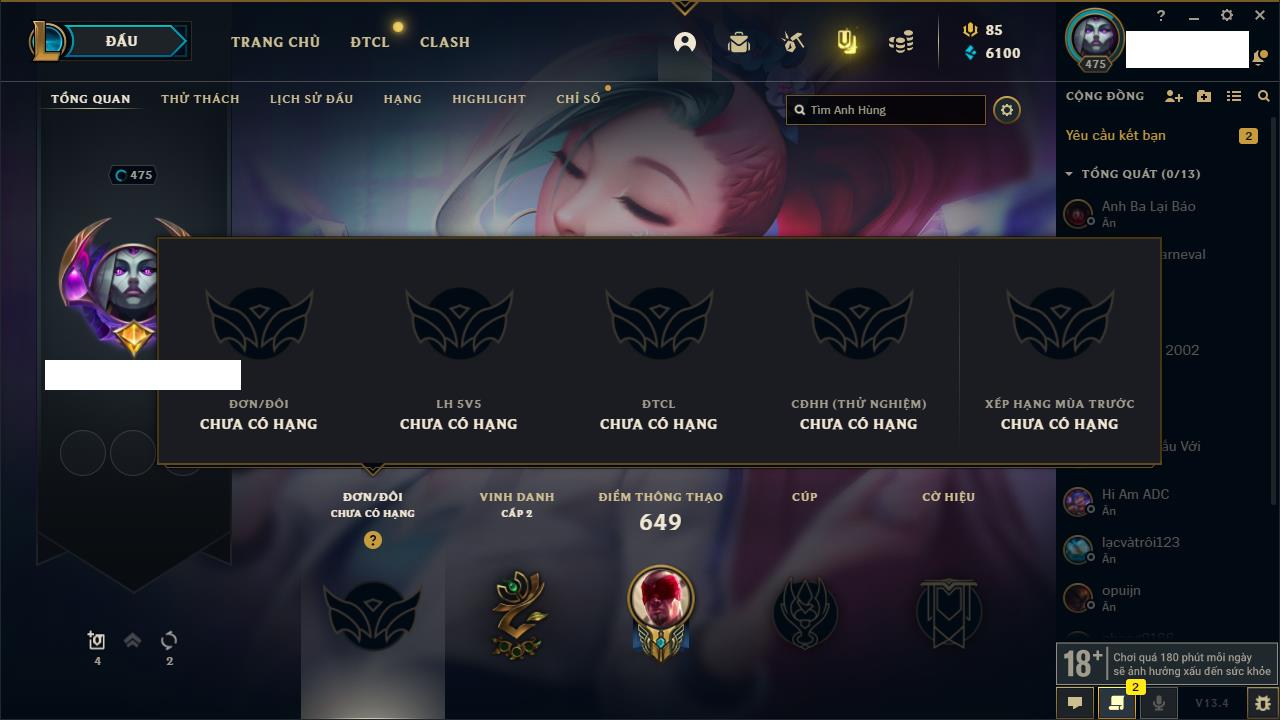 Rank Đơn: Chưa RankKhung: Bạch kimTướng: 171 - Còn 182788 THXTrang Phục: 158Rank ĐTCL: Chưa RankLinh Thú: 56
