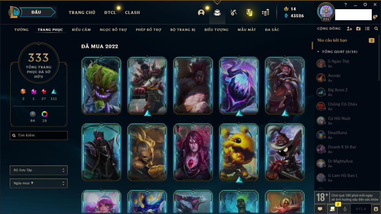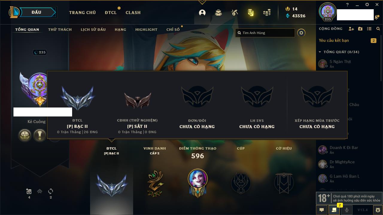 Rank Đơn: Vàng IKhung: BạcTướng: 171 - Còn 60584 THXTrang Phục: 286Rank ĐTCL: Vàng IIILinh Thú: 117