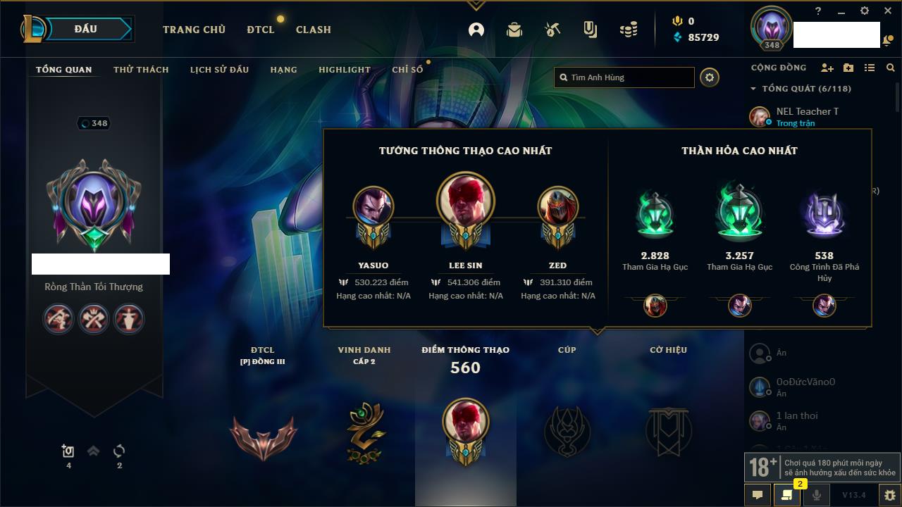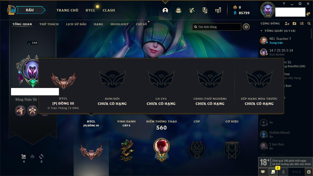 Rank Đơn: Vàng IKhung: BạcTướng: 171 - Còn 60584 THXTrang Phục: 286Rank ĐTCL: Vàng IIILinh Thú: 117