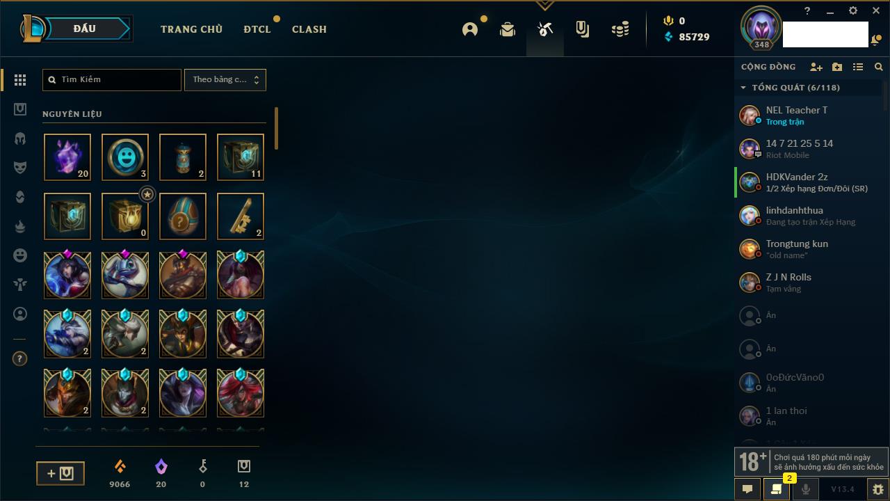 Rank Đơn: Bạch Kim IIIKhung: Bạch kimTướng: 171 - Còn 251383 THXTrang Phục: 229Rank ĐTCL: Sắt IILinh Thú: 51