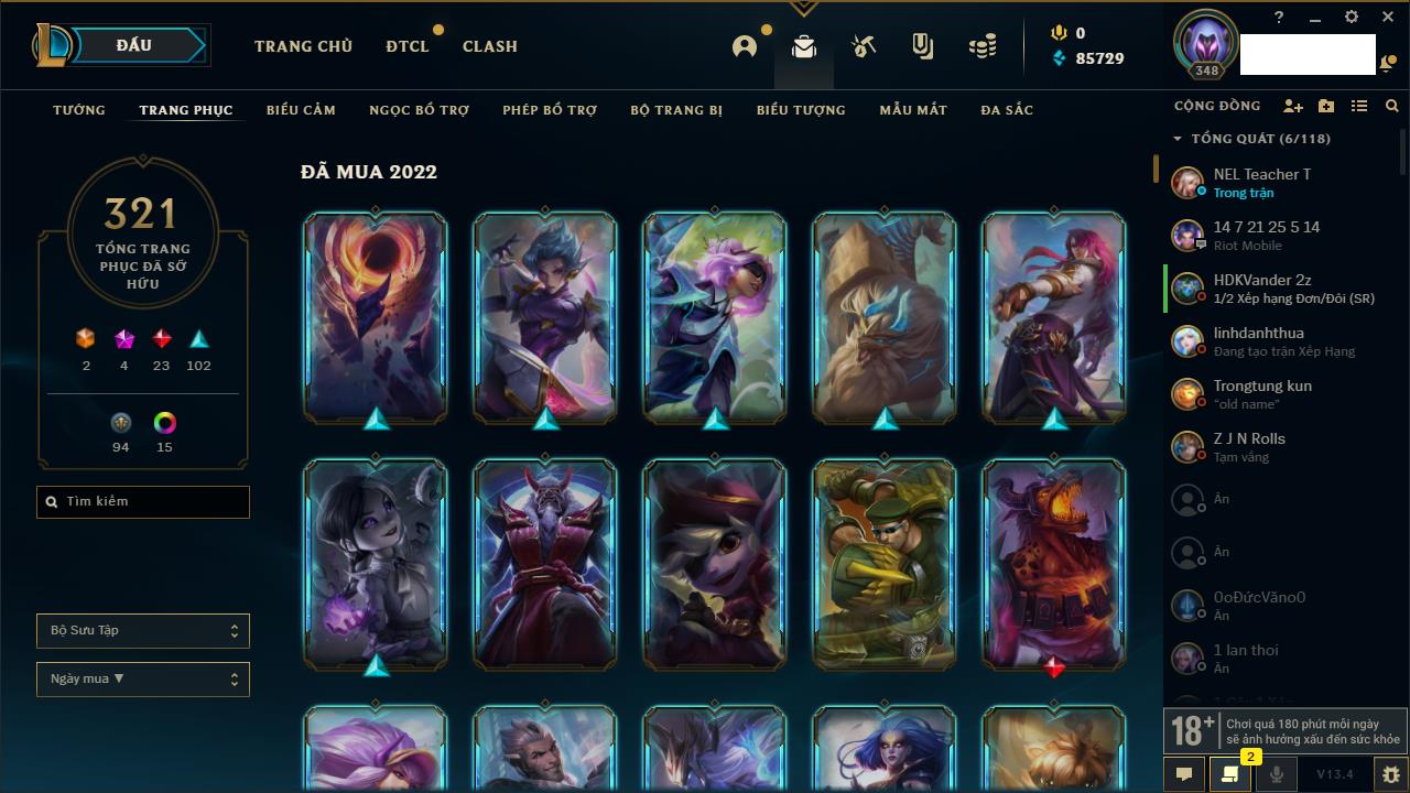 Rank Đơn: Vàng IIIKhung: VàngTướng: 171 - Còn 88128 THXTrang Phục: 329Rank ĐTCL: Chưa RankLinh Thú: 41
