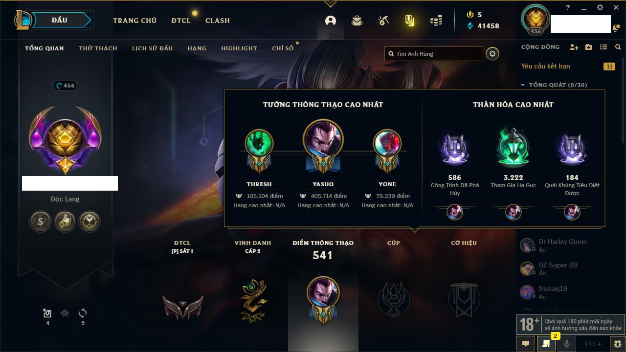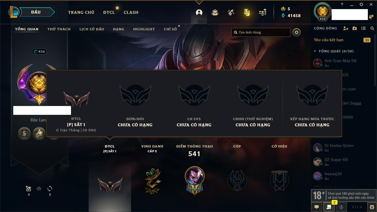 Rank Đơn: Vàng IKhung: BạcTướng: 171 - Còn 60584 THXTrang Phục: 286Rank ĐTCL: Vàng IIILinh Thú: 117