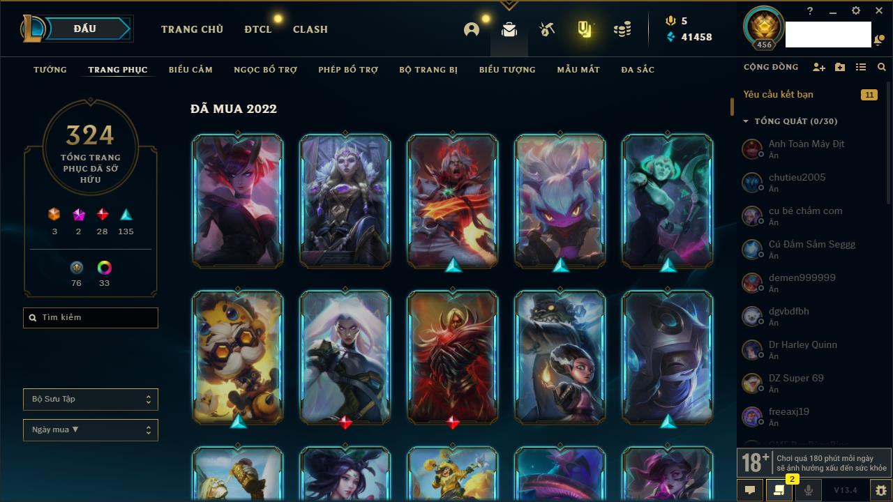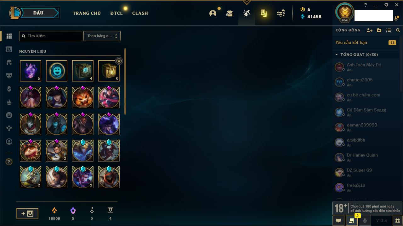 Rank Đơn: Vàng IIIKhung: VàngTướng: 171 - Còn 88128 THXTrang Phục: 329Rank ĐTCL: Chưa RankLinh Thú: 41