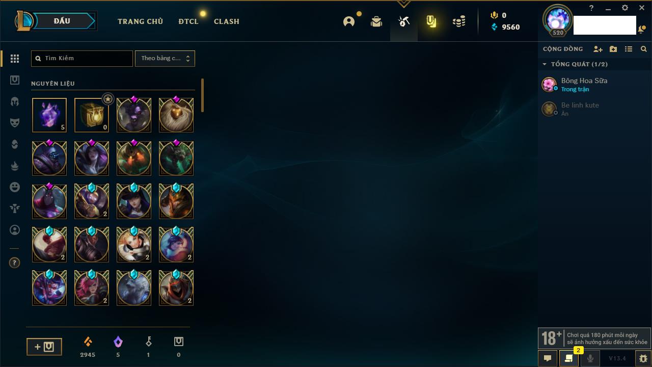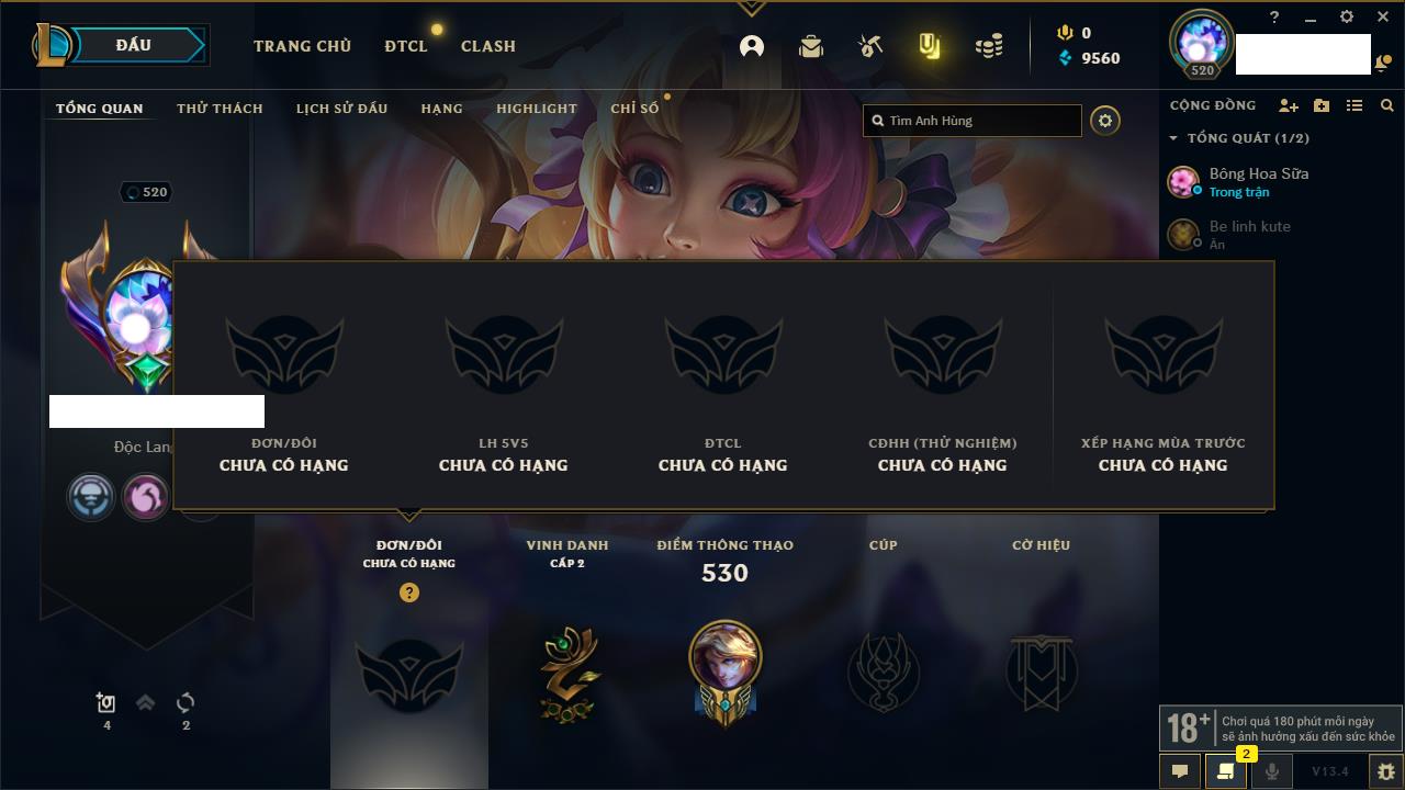 Rank Đơn: Vàng IKhung: BạcTướng: 171 - Còn 60584 THXTrang Phục: 286Rank ĐTCL: Vàng IIILinh Thú: 117