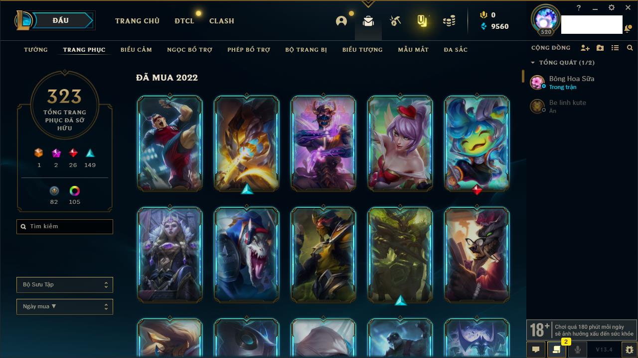 Rank Đơn: Vàng IIIKhung: VàngTướng: 171 - Còn 88128 THXTrang Phục: 329Rank ĐTCL: Chưa RankLinh Thú: 41