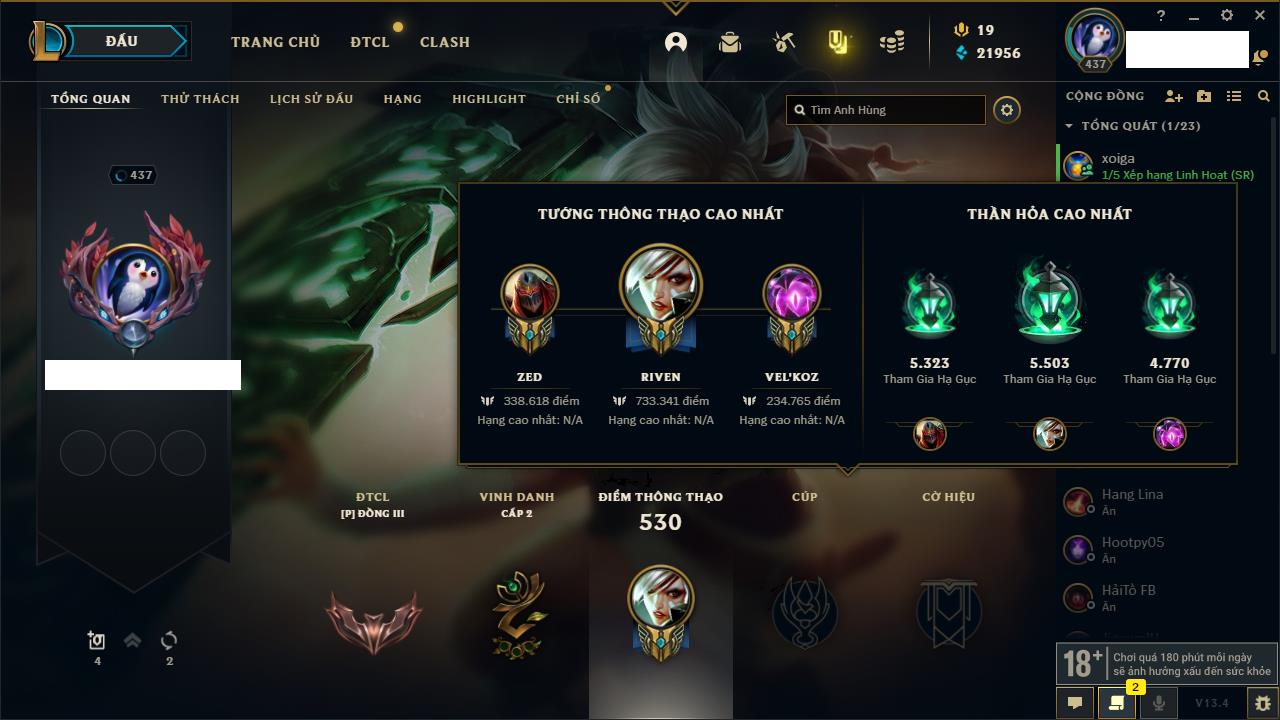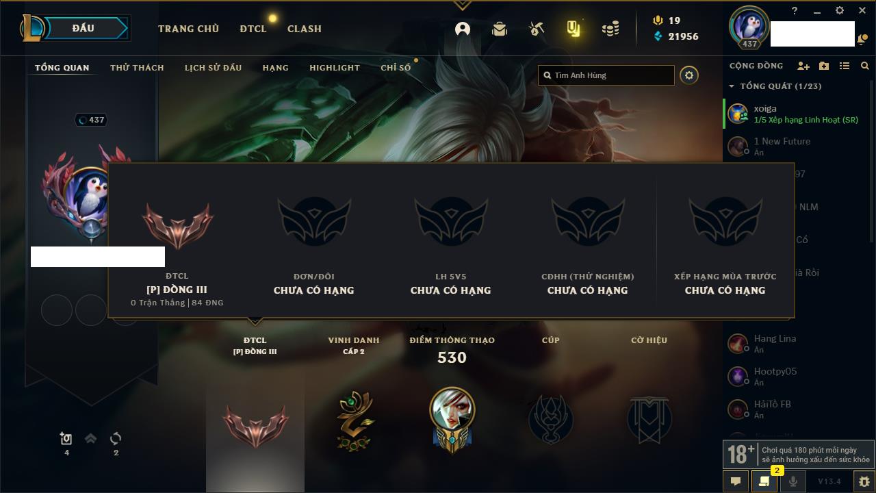 Rank Đơn: Vàng IKhung: BạcTướng: 171 - Còn 60584 THXTrang Phục: 286Rank ĐTCL: Vàng IIILinh Thú: 117