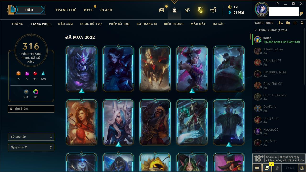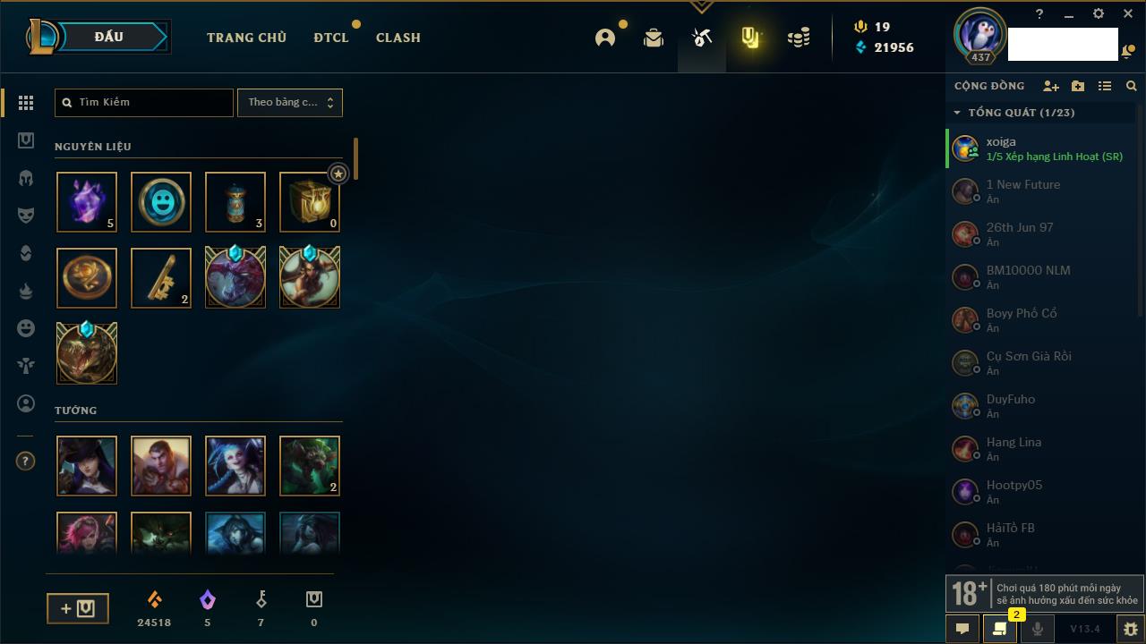 Rank Đơn: Vàng IIIKhung: VàngTướng: 171 - Còn 88128 THXTrang Phục: 329Rank ĐTCL: Chưa RankLinh Thú: 41