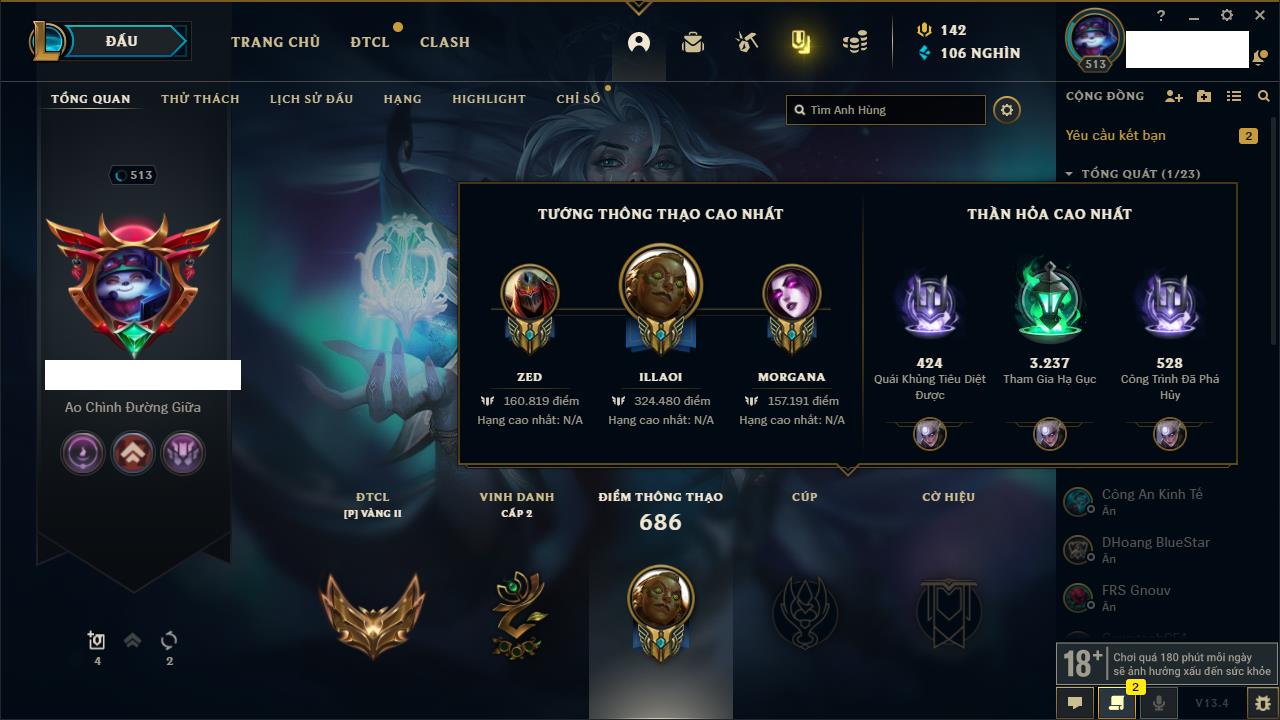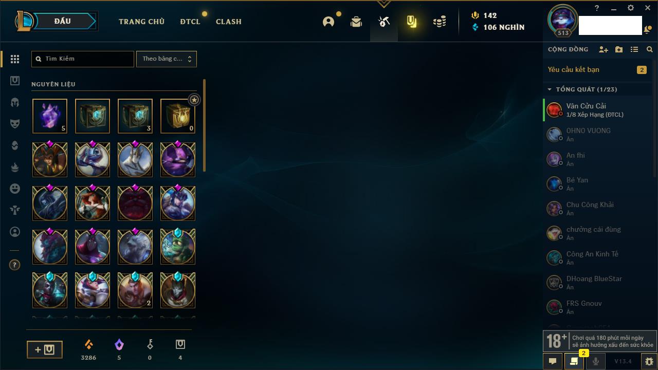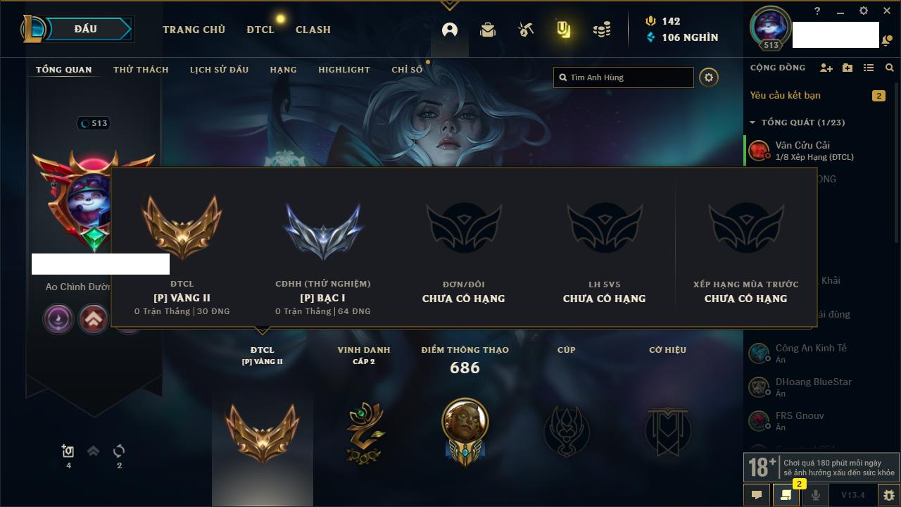 Rank Đơn: Vàng IKhung: BạcTướng: 171 - Còn 60584 THXTrang Phục: 286Rank ĐTCL: Vàng IIILinh Thú: 117