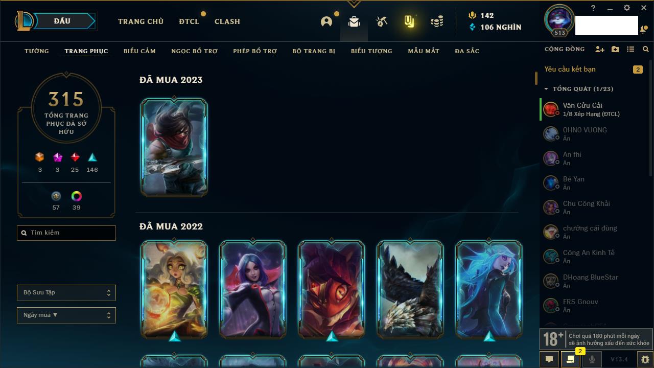 Rank Đơn: Vàng IIIKhung: VàngTướng: 171 - Còn 88128 THXTrang Phục: 329Rank ĐTCL: Chưa RankLinh Thú: 41