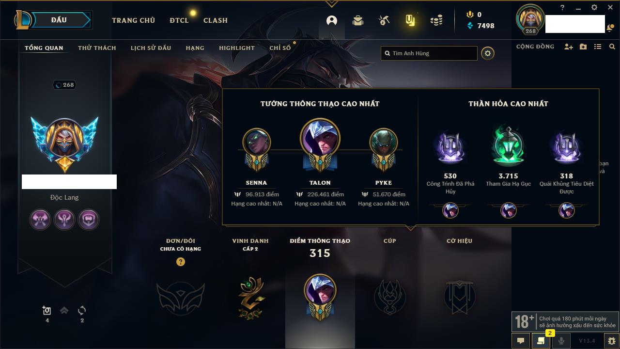 Rank Đơn: Bạch Kim IVKhung: Bạch kimTướng: 171 - Còn 54021 THXTrang Phục: 327Rank ĐTCL: Chưa RankLinh Thú: 115