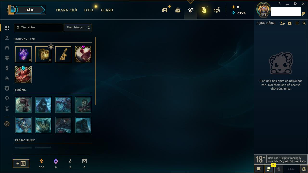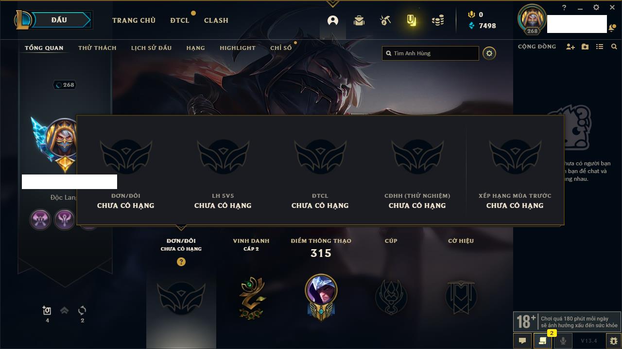 Rank Đơn: Vàng IKhung: BạcTướng: 171 - Còn 60584 THXTrang Phục: 286Rank ĐTCL: Vàng IIILinh Thú: 117