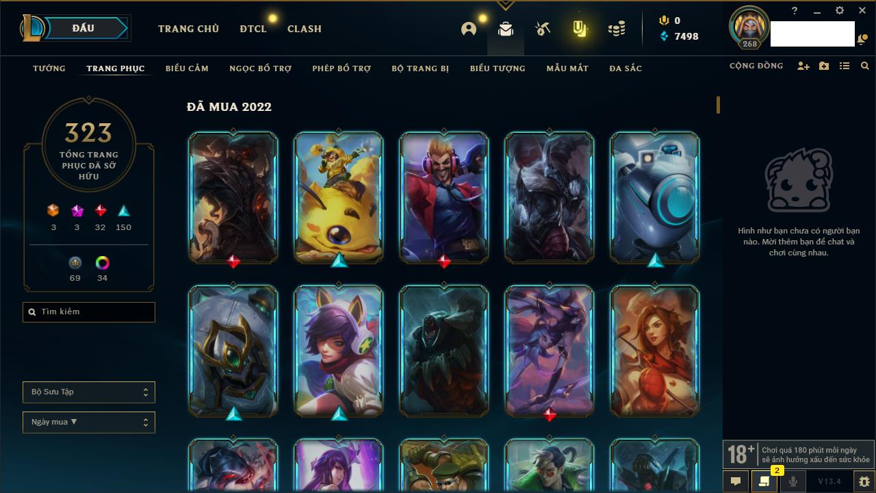 Rank Đơn: Vàng IIIKhung: VàngTướng: 171 - Còn 88128 THXTrang Phục: 329Rank ĐTCL: Chưa RankLinh Thú: 41