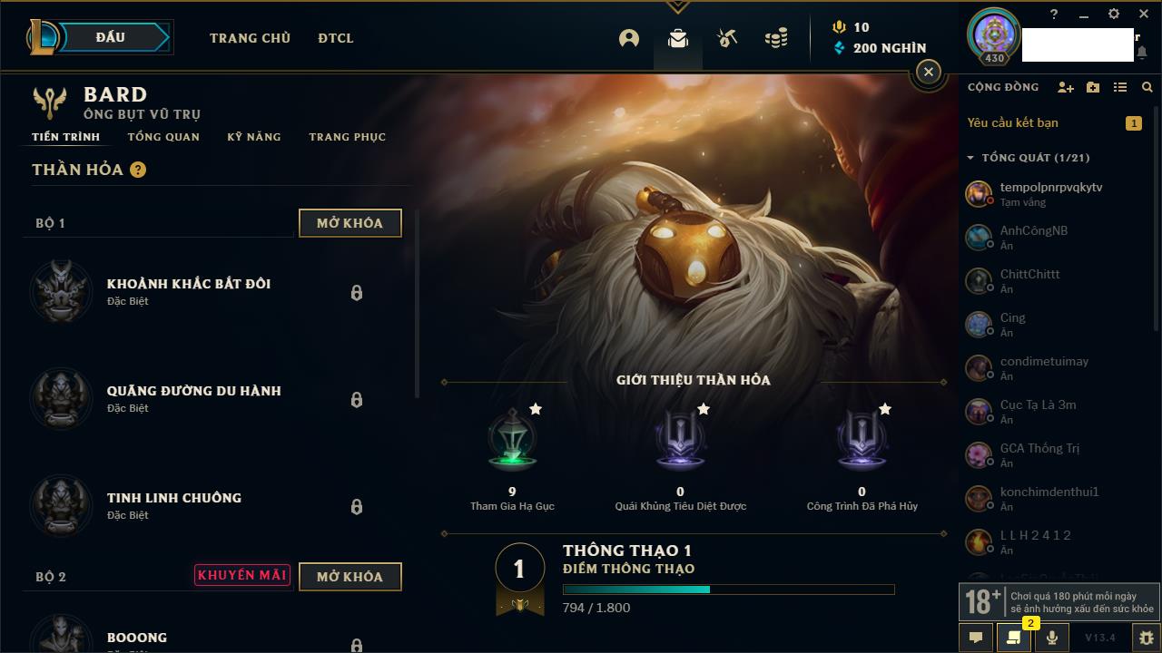 Rank Đơn: Bạc IIKhung: Bạch kimTướng: 169 - Còn 81813 THXTrang Phục: 301Rank ĐTCL: Chưa RankLinh Thú: 140