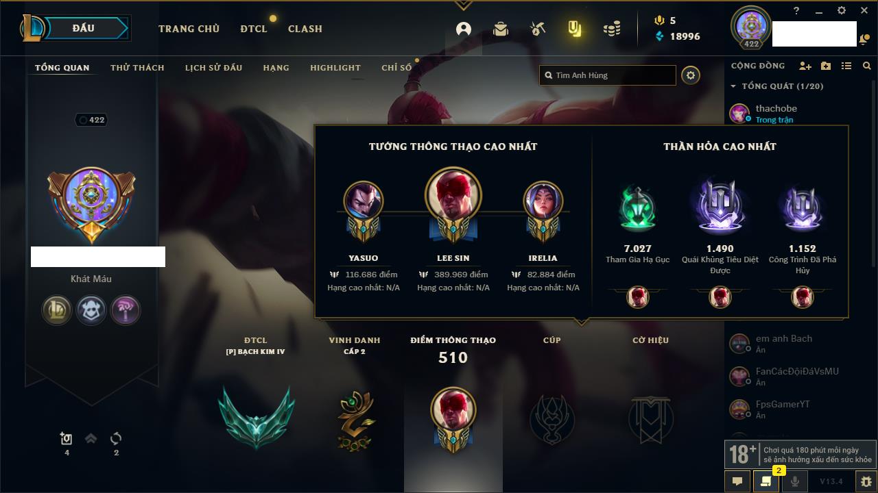 Rank Đơn: Bạch Kim IKhung: Bạch kimTướng: 171 - Còn 131918 THXTrang Phục: 297Rank ĐTCL: Chưa RankLinh Thú: 118
