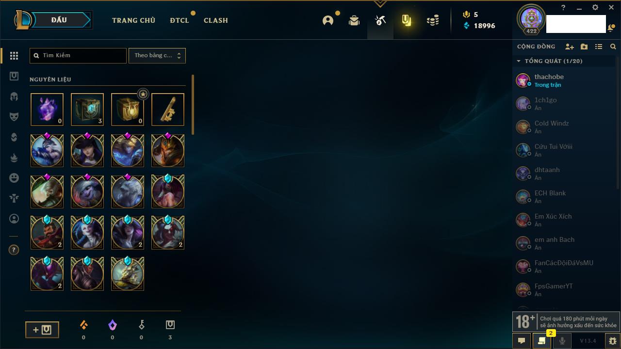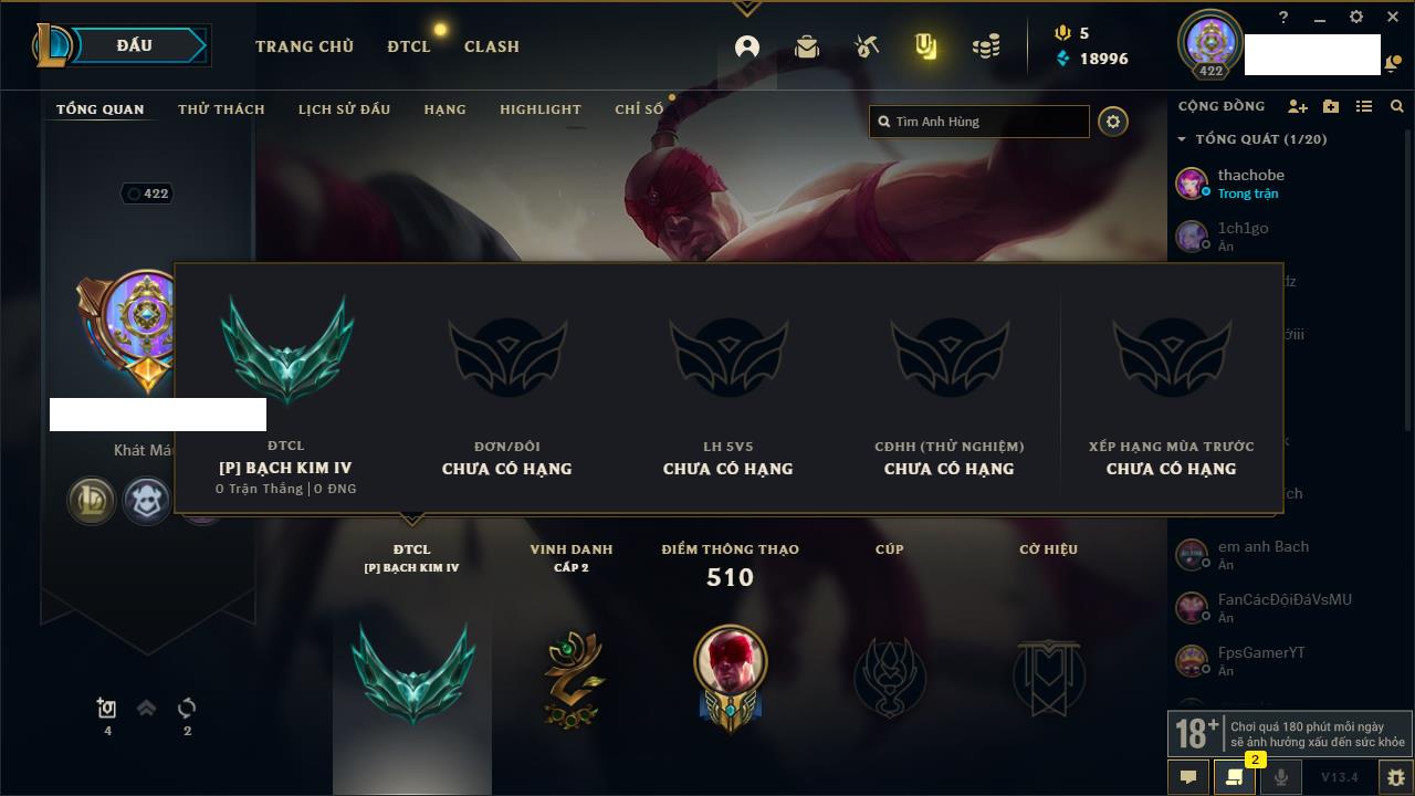 Rank Đơn: Bạch Kim IIIKhung: Bạch kimTướng: 171 - Còn 251383 THXTrang Phục: 229Rank ĐTCL: Sắt IILinh Thú: 51