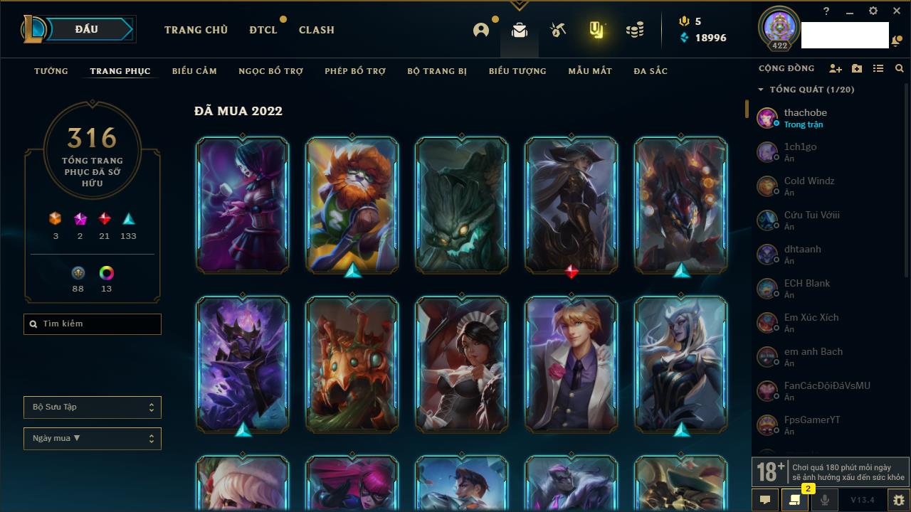 Rank Đơn: Vàng IIIKhung: VàngTướng: 171 - Còn 88128 THXTrang Phục: 329Rank ĐTCL: Chưa RankLinh Thú: 41