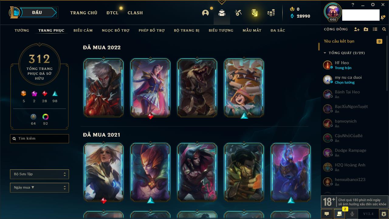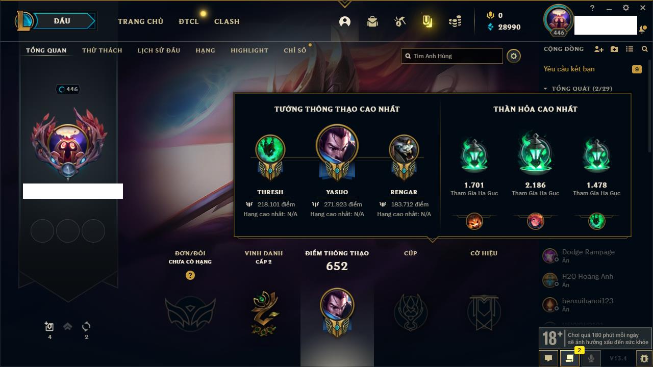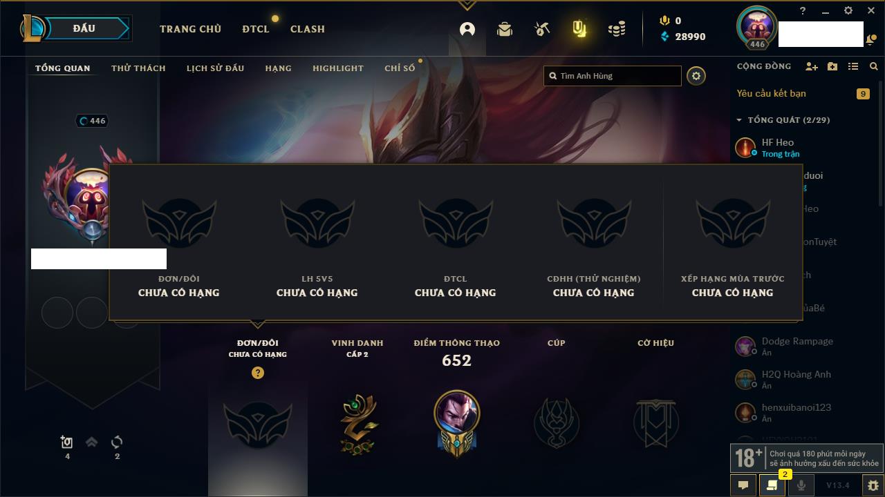 Rank Đơn: Bạc IIKhung: Bạch kimTướng: 169 - Còn 81813 THXTrang Phục: 301Rank ĐTCL: Chưa RankLinh Thú: 140