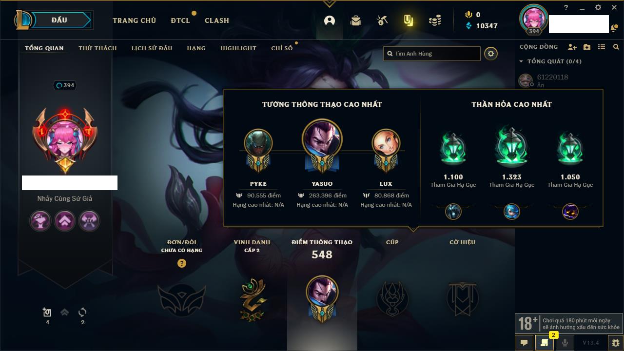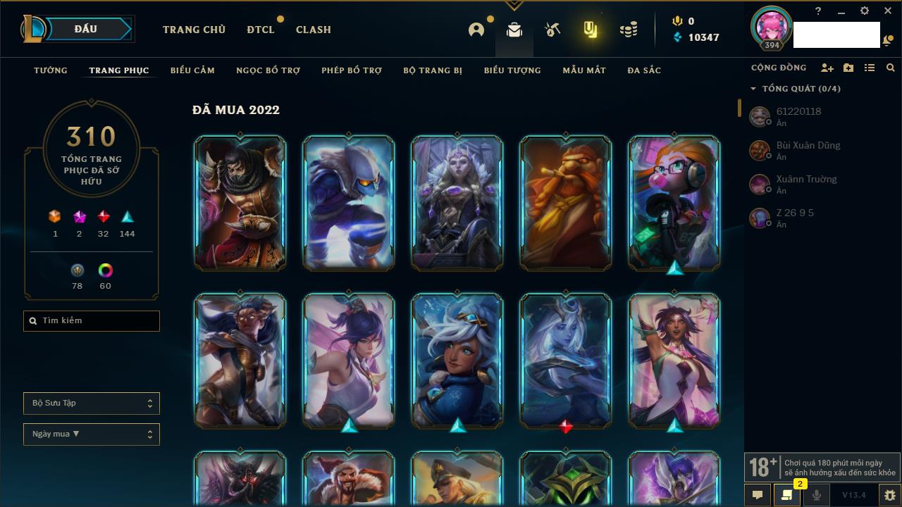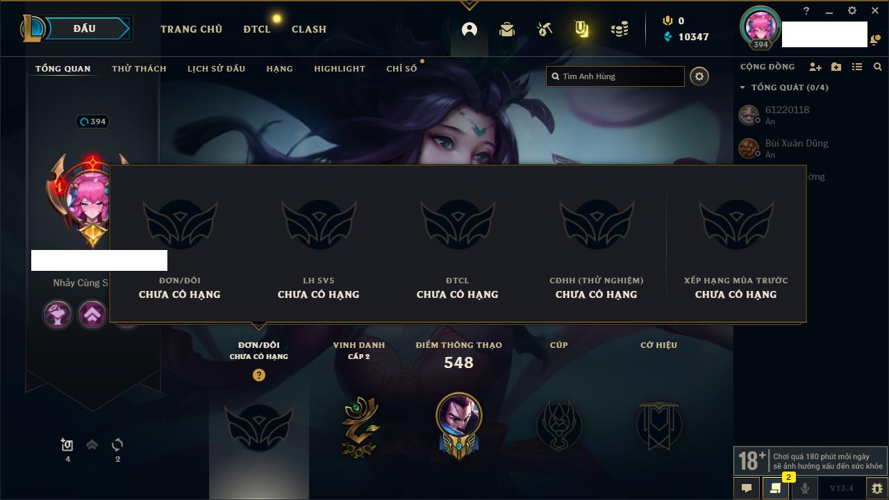Rank Đơn: Vàng IKhung: BạcTướng: 171 - Còn 60584 THXTrang Phục: 286Rank ĐTCL: Vàng IIILinh Thú: 117