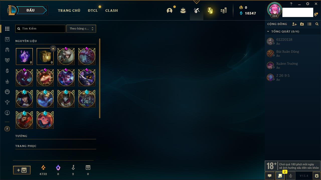 Rank Đơn: Vàng IIIKhung: VàngTướng: 171 - Còn 88128 THXTrang Phục: 329Rank ĐTCL: Chưa RankLinh Thú: 41