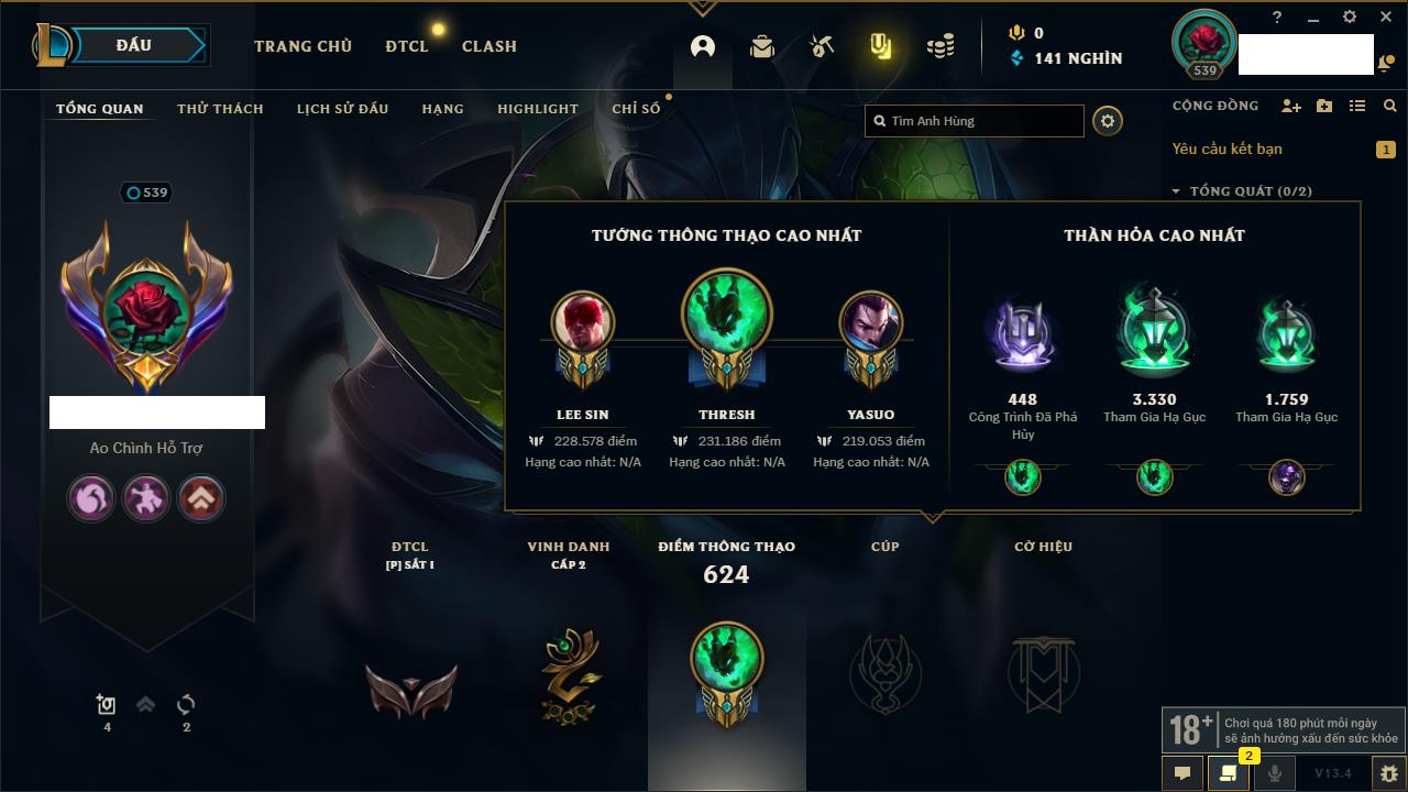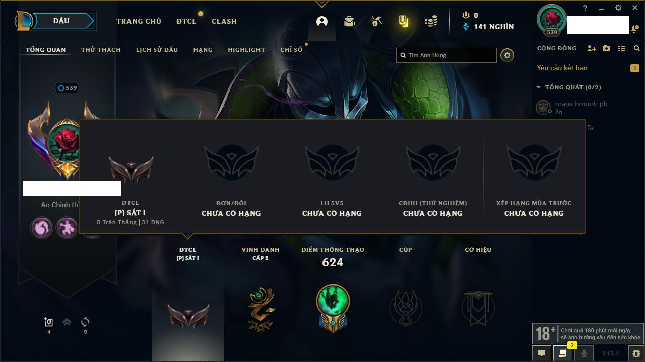 Rank Đơn: Chưa RankKhung: Chưa có khungTướng: 165 - Còn 1609 THXTrang Phục: 25Rank ĐTCL: Chưa RankLinh Thú: 44