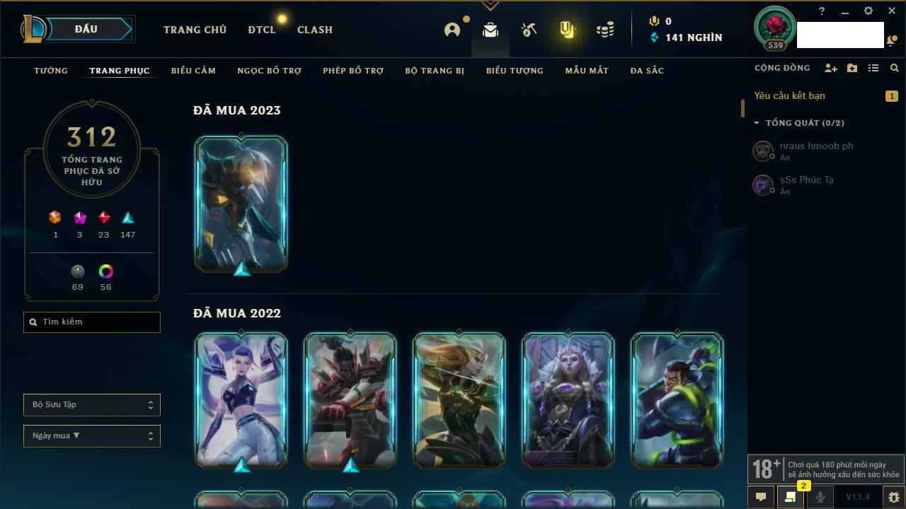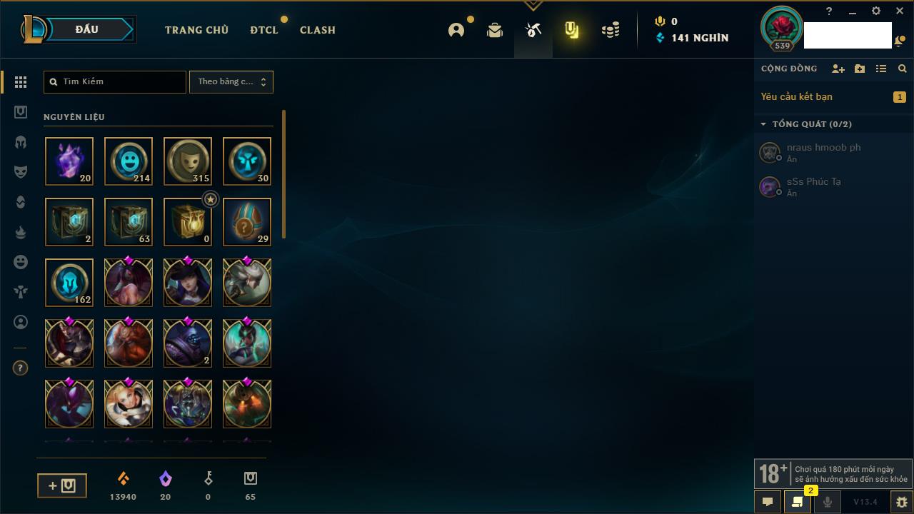 Rank Đơn: Bạc IIKhung: Bạch kimTướng: 169 - Còn 81813 THXTrang Phục: 301Rank ĐTCL: Chưa RankLinh Thú: 140