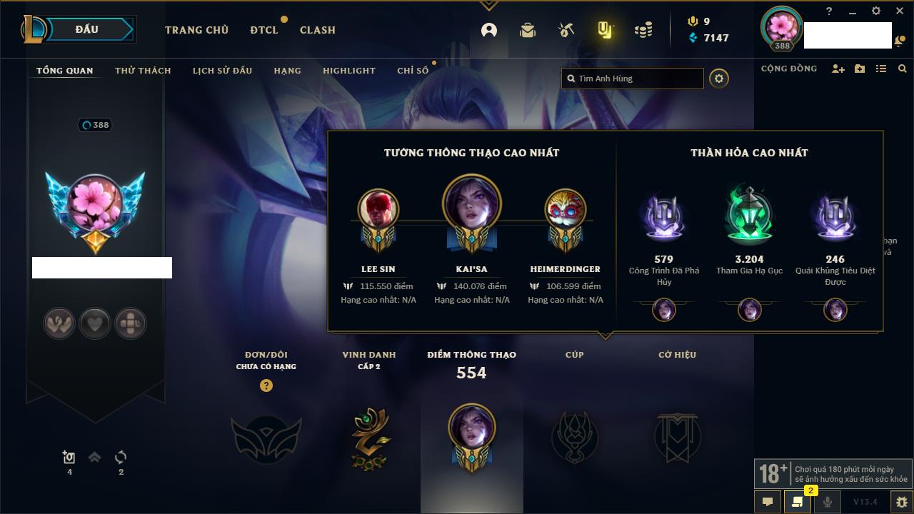 Rank Đơn: Bạch Kim IIIKhung: Bạch kimTướng: 171 - Còn 251383 THXTrang Phục: 229Rank ĐTCL: Sắt IILinh Thú: 51