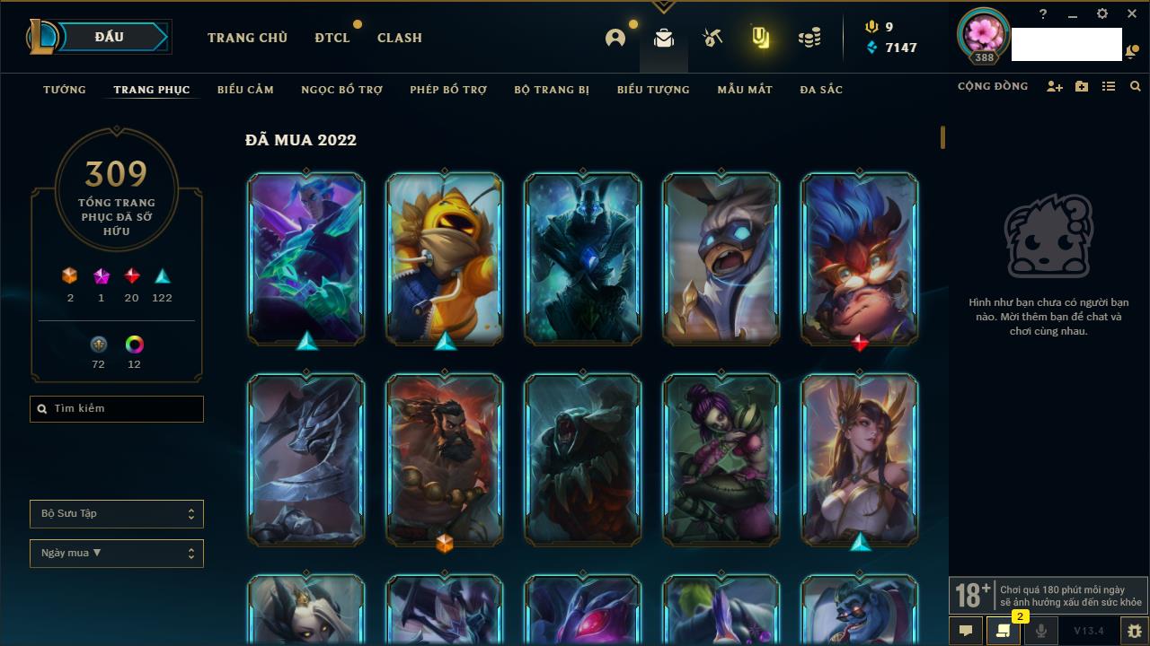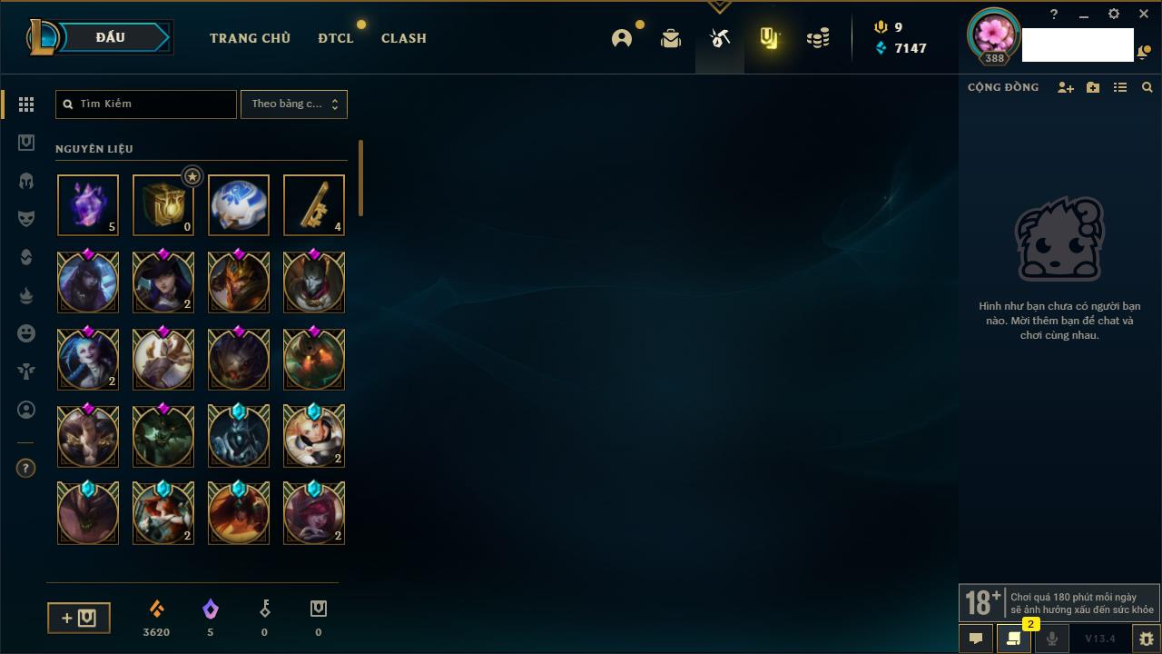 Rank Đơn: Vàng IIIKhung: VàngTướng: 171 - Còn 88128 THXTrang Phục: 329Rank ĐTCL: Chưa RankLinh Thú: 41