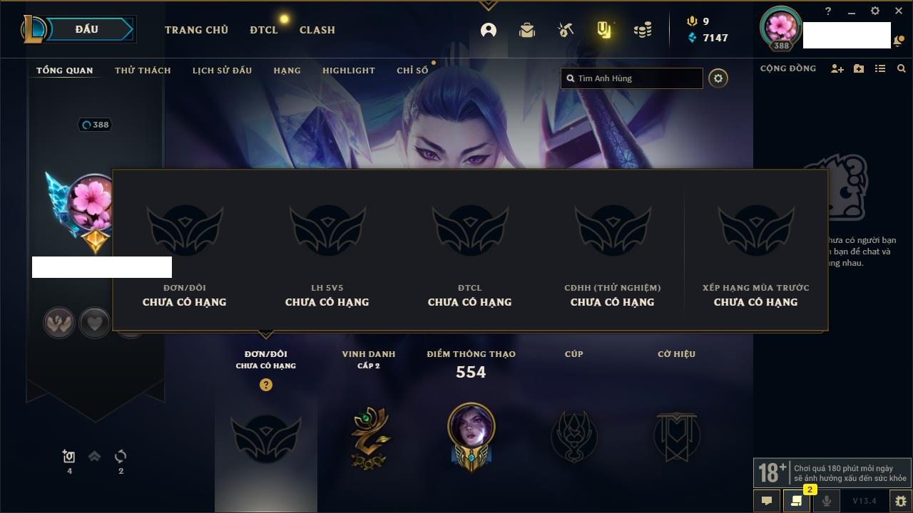 Rank Đơn: Vàng IKhung: BạcTướng: 171 - Còn 60584 THXTrang Phục: 286Rank ĐTCL: Vàng IIILinh Thú: 117