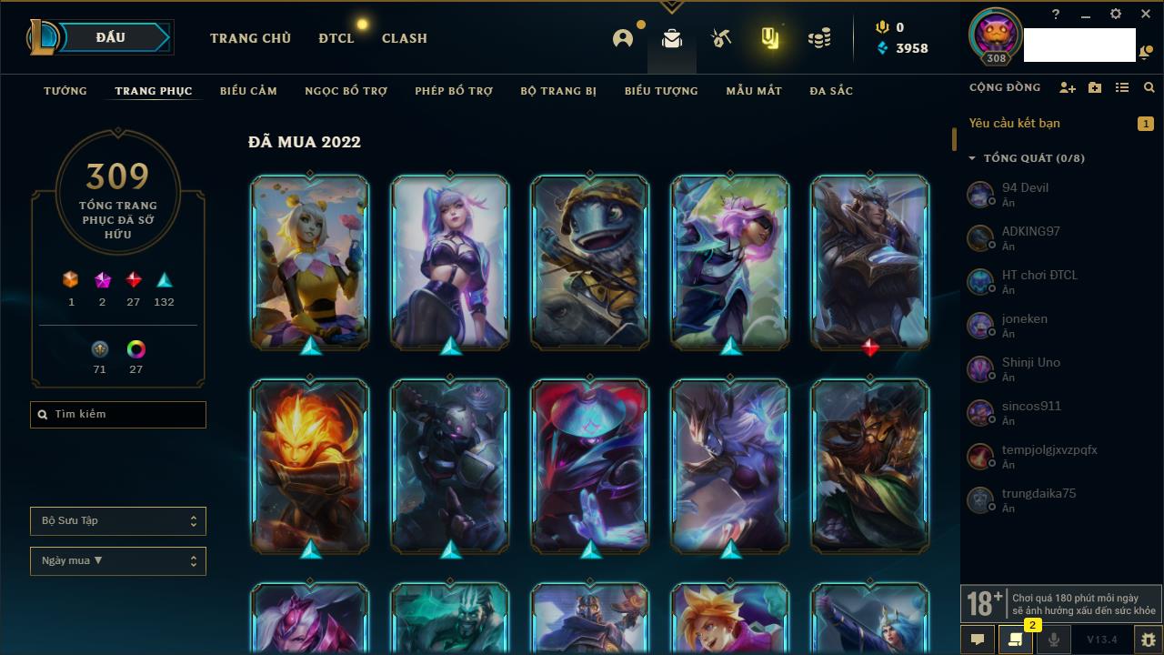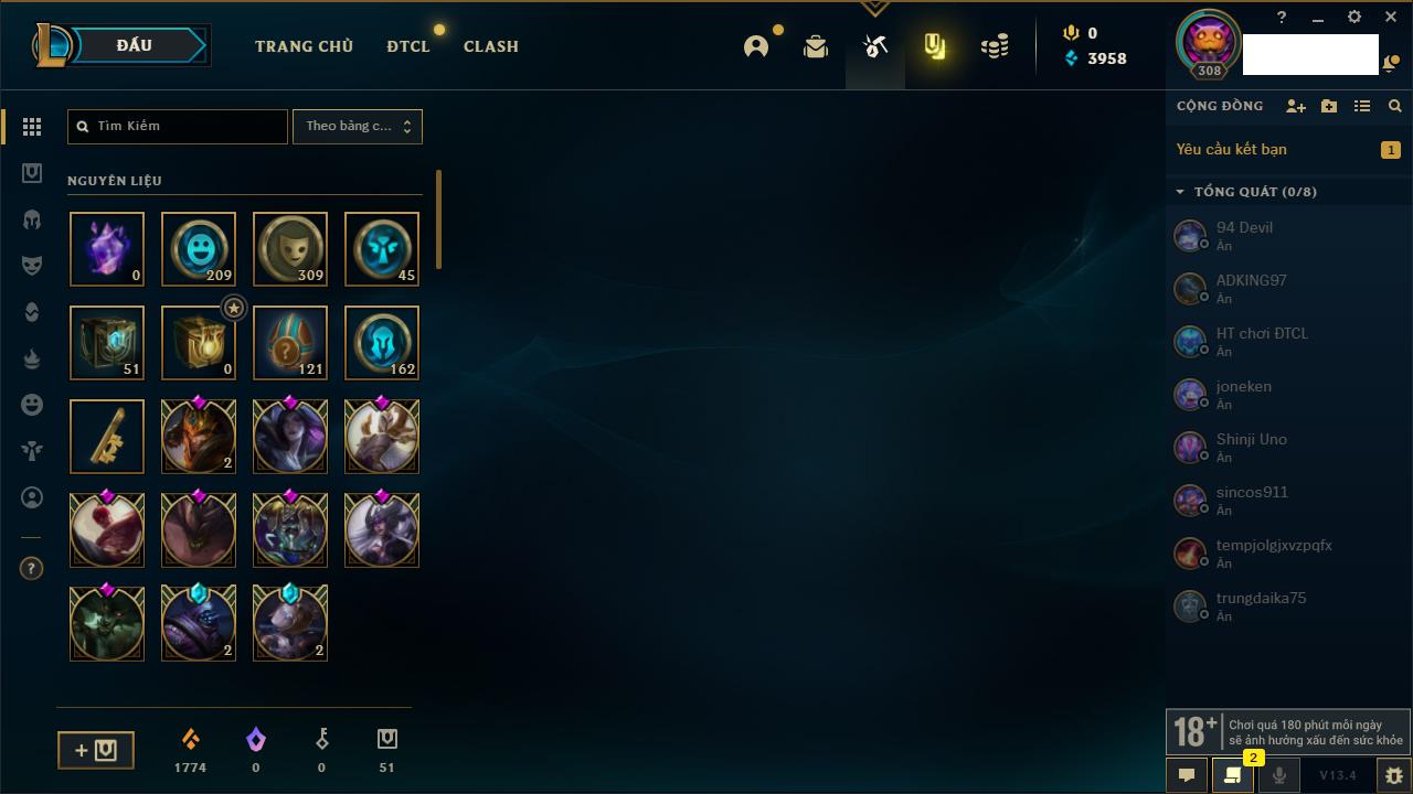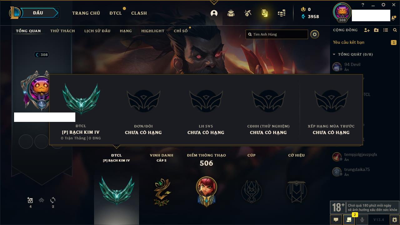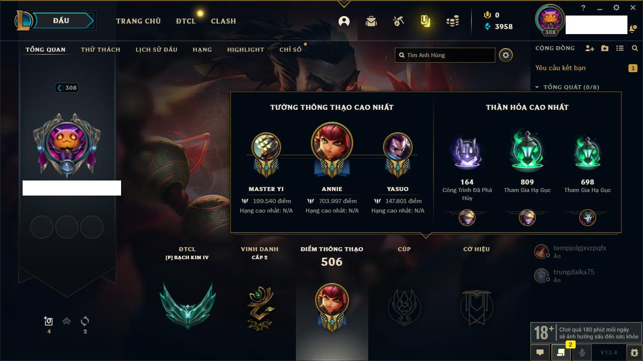 Rank Đơn: Bạc IIKhung: Bạch kimTướng: 169 - Còn 81813 THXTrang Phục: 301Rank ĐTCL: Chưa RankLinh Thú: 140