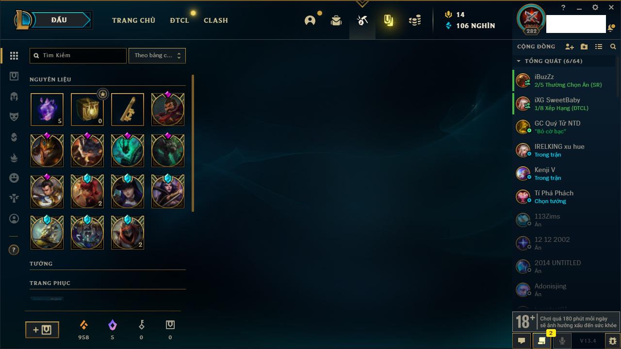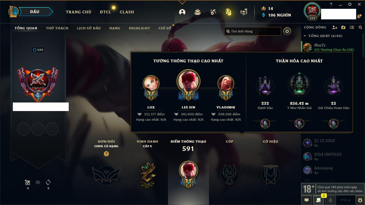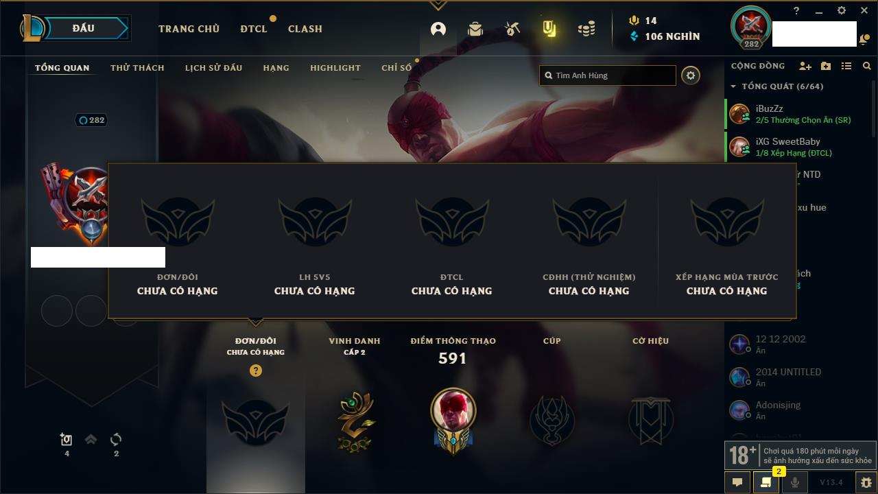 Rank Đơn: Vàng IKhung: BạcTướng: 171 - Còn 60584 THXTrang Phục: 286Rank ĐTCL: Vàng IIILinh Thú: 117