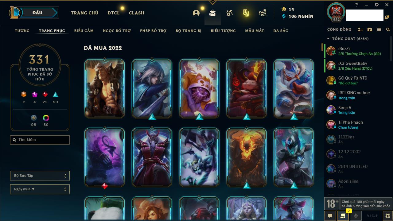 Rank Đơn: Vàng IIIKhung: VàngTướng: 171 - Còn 88128 THXTrang Phục: 329Rank ĐTCL: Chưa RankLinh Thú: 41