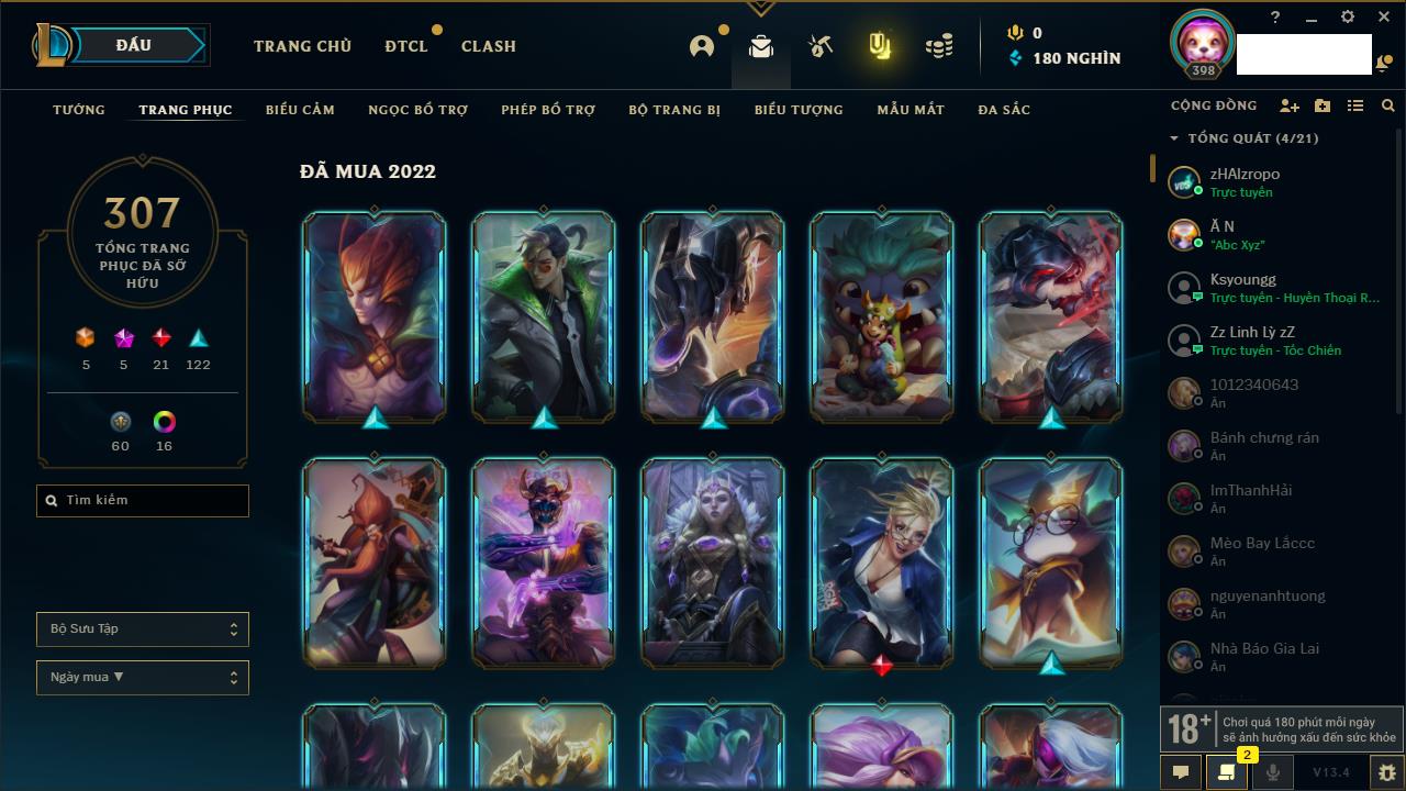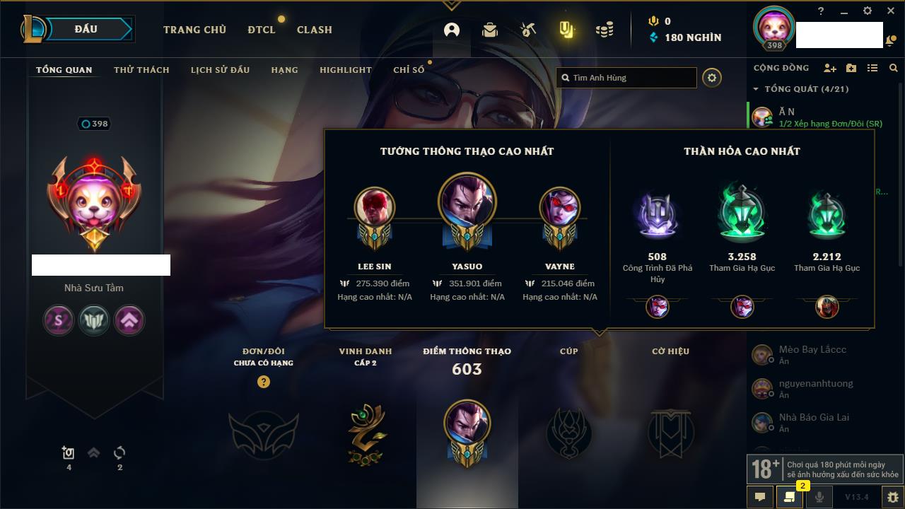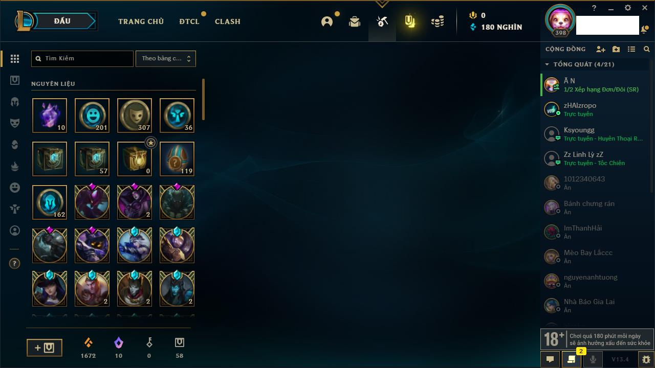 Rank Đơn: Bạc IIKhung: Bạch kimTướng: 169 - Còn 81813 THXTrang Phục: 301Rank ĐTCL: Chưa RankLinh Thú: 140