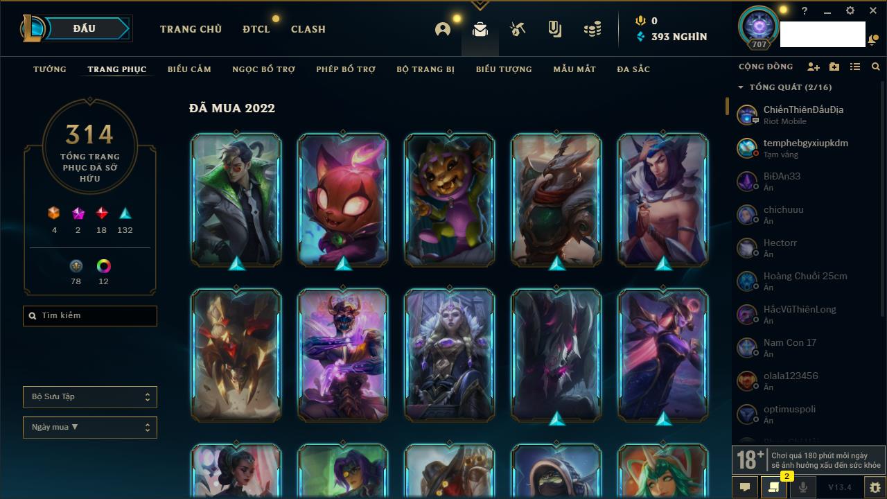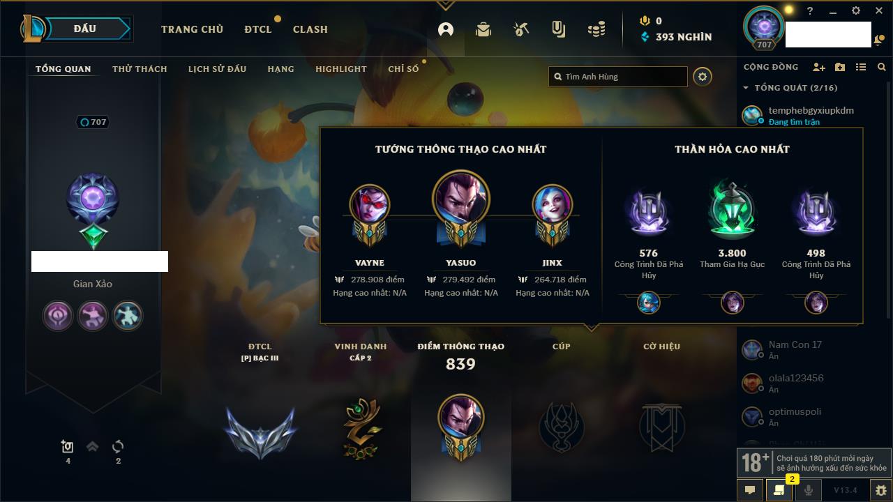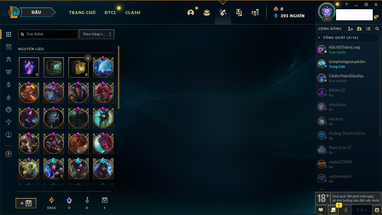 Rank Đơn: Vàng IKhung: Bạch kimTướng: 170 - Còn 212450 THXTrang Phục: 214Rank ĐTCL: Bạch Kim IVLinh Thú: 221