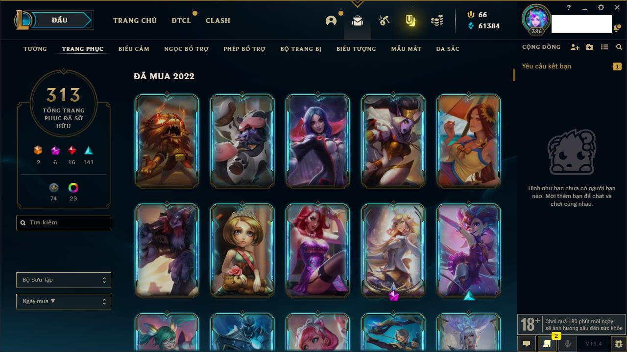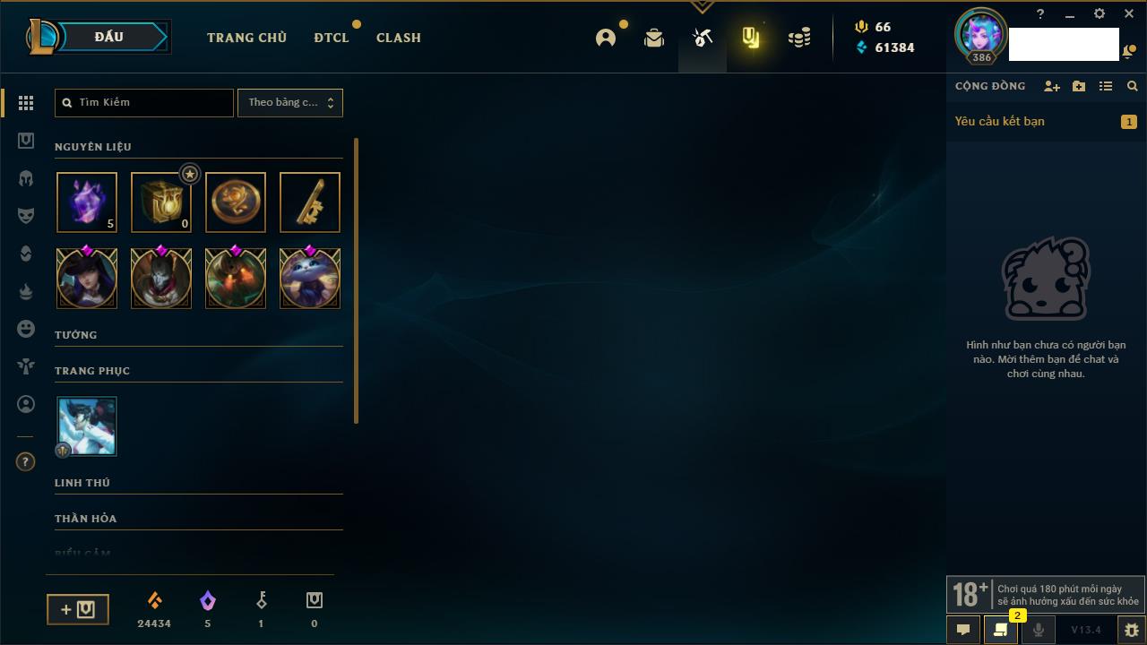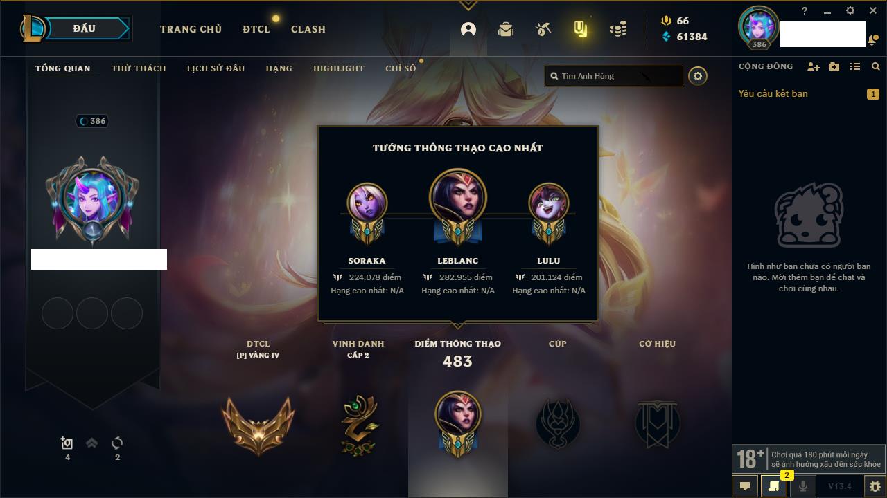 Rank Đơn: Vàng IKhung: BạcTướng: 171 - Còn 60584 THXTrang Phục: 286Rank ĐTCL: Vàng IIILinh Thú: 117