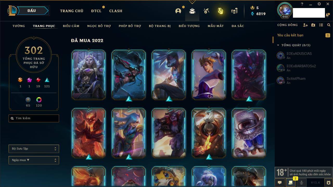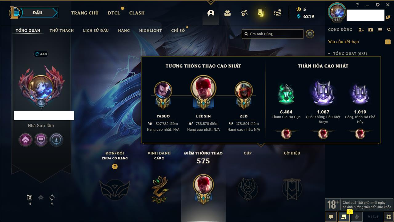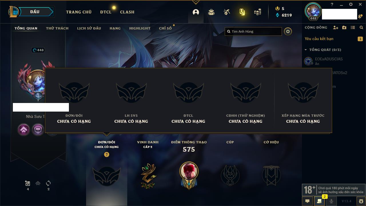Rank Đơn: Vàng IKhung: BạcTướng: 171 - Còn 60584 THXTrang Phục: 286Rank ĐTCL: Vàng IIILinh Thú: 117