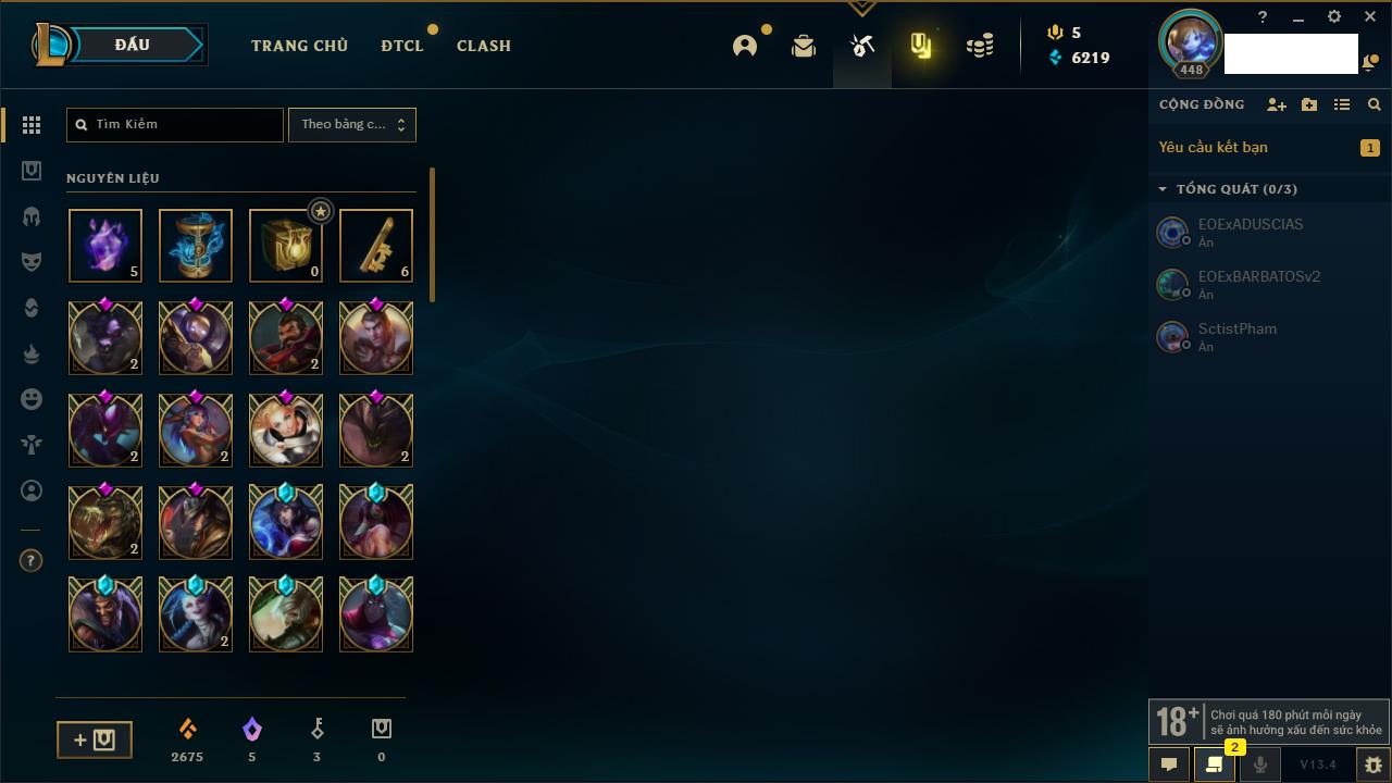 Rank Đơn: Vàng IVKhung: VàngTướng: 171 - Còn 660284 THXTrang Phục: 199Rank ĐTCL: Chưa RankLinh Thú: 34