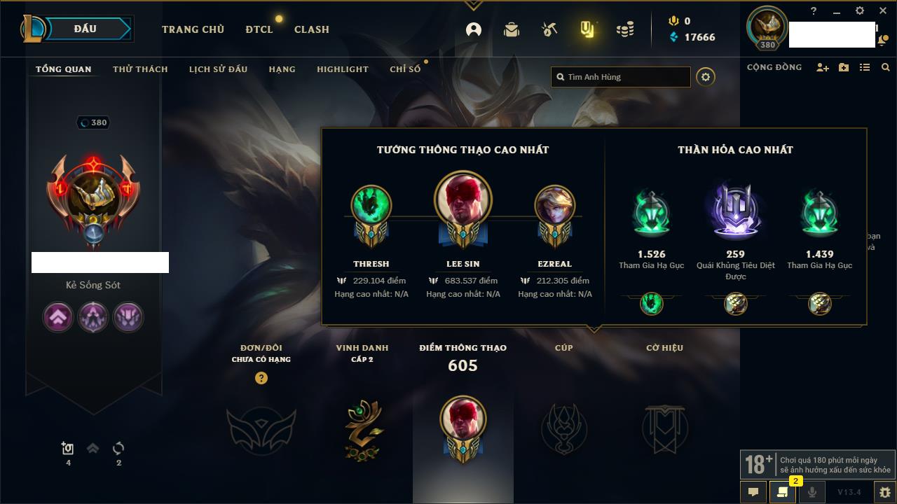 Rank Đơn: Bạch Kim IKhung: Bạch kimTướng: 171 - Còn 131918 THXTrang Phục: 297Rank ĐTCL: Chưa RankLinh Thú: 118