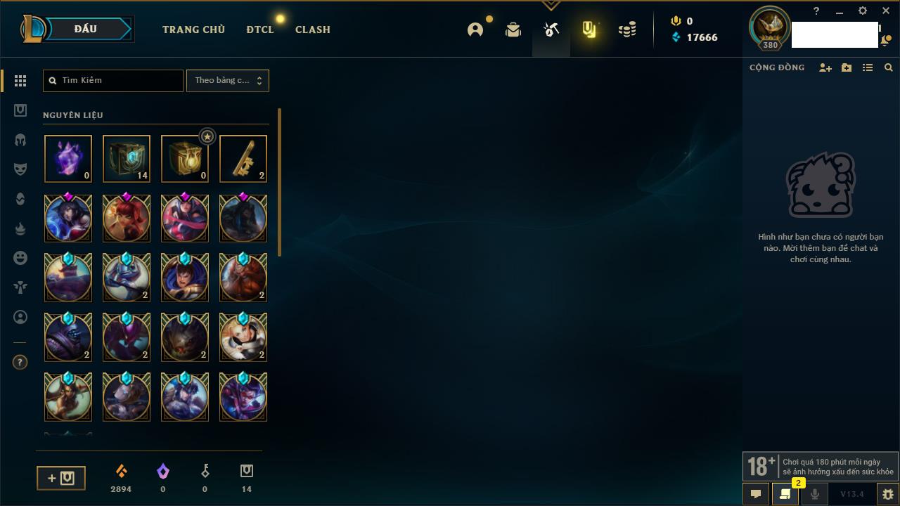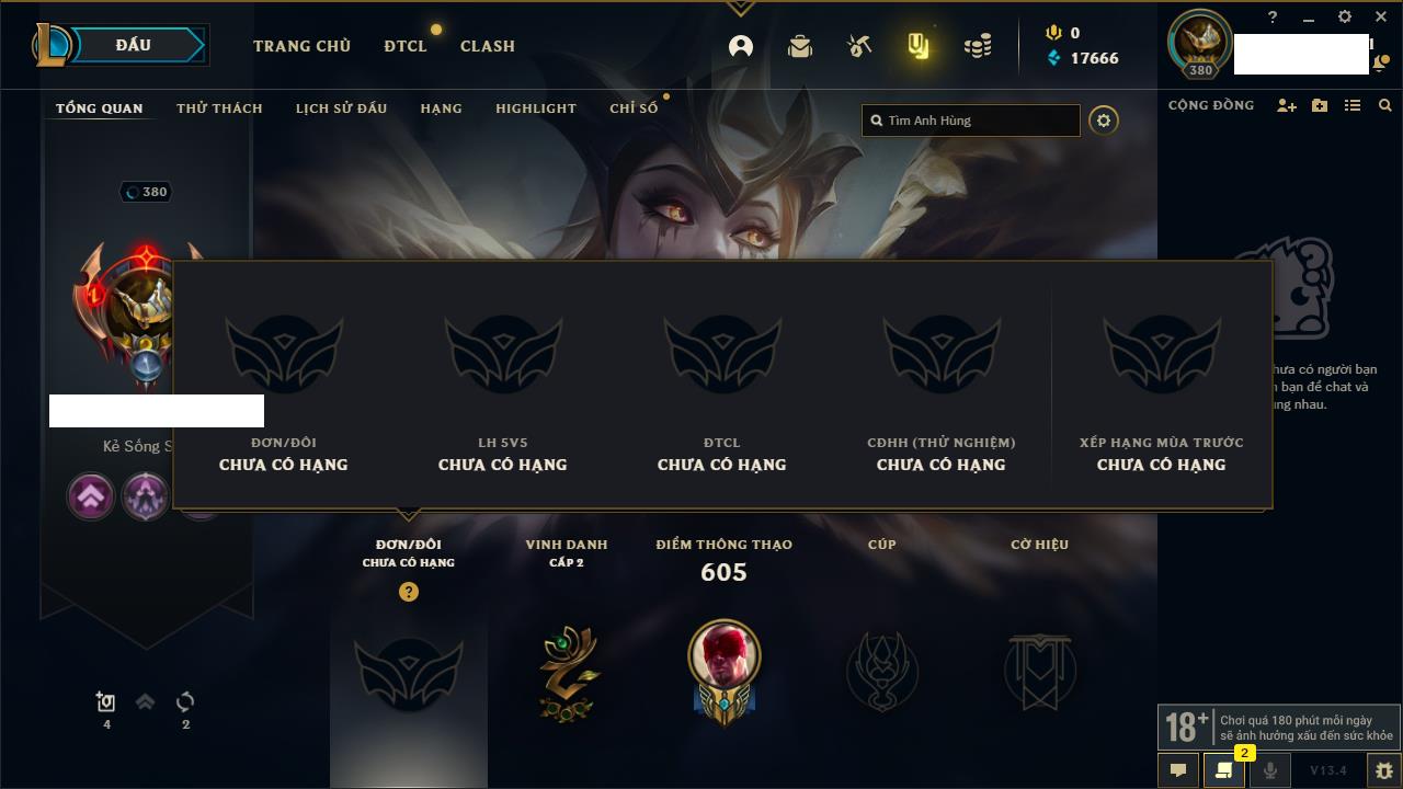 Rank Đơn: Vàng IKhung: BạcTướng: 171 - Còn 60584 THXTrang Phục: 286Rank ĐTCL: Vàng IIILinh Thú: 117