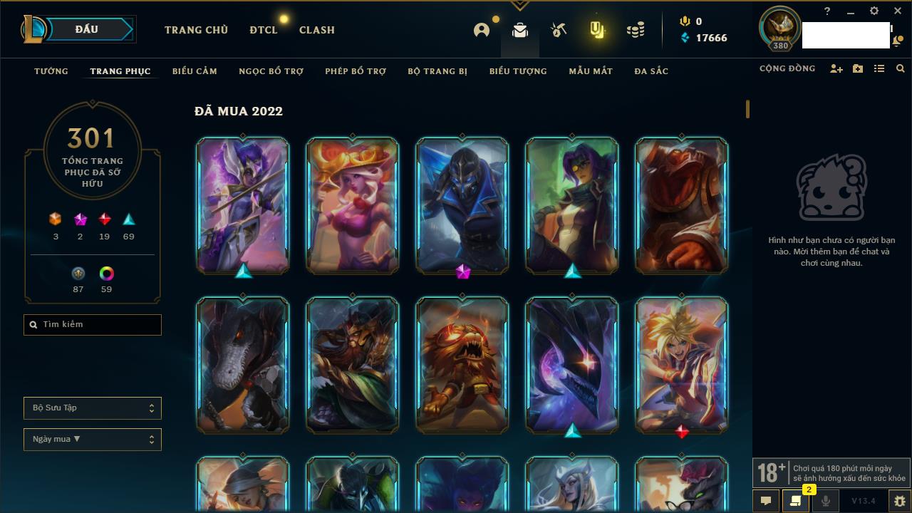 Rank Đơn: Vàng IIIKhung: VàngTướng: 171 - Còn 88128 THXTrang Phục: 329Rank ĐTCL: Chưa RankLinh Thú: 41