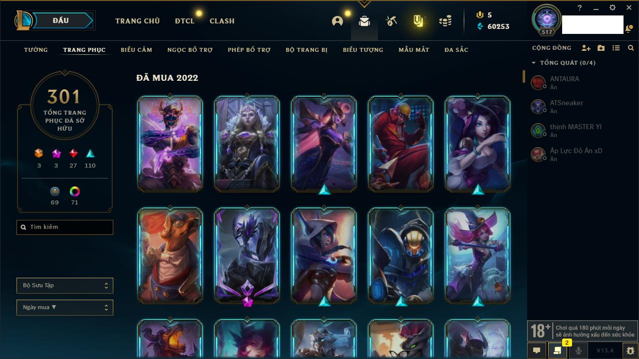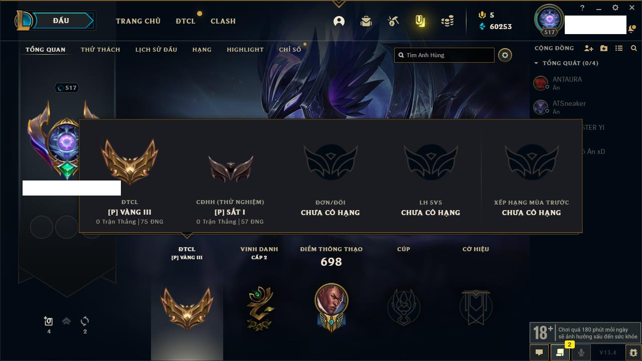 Rank Đơn: Vàng IKhung: BạcTướng: 171 - Còn 60584 THXTrang Phục: 286Rank ĐTCL: Vàng IIILinh Thú: 117