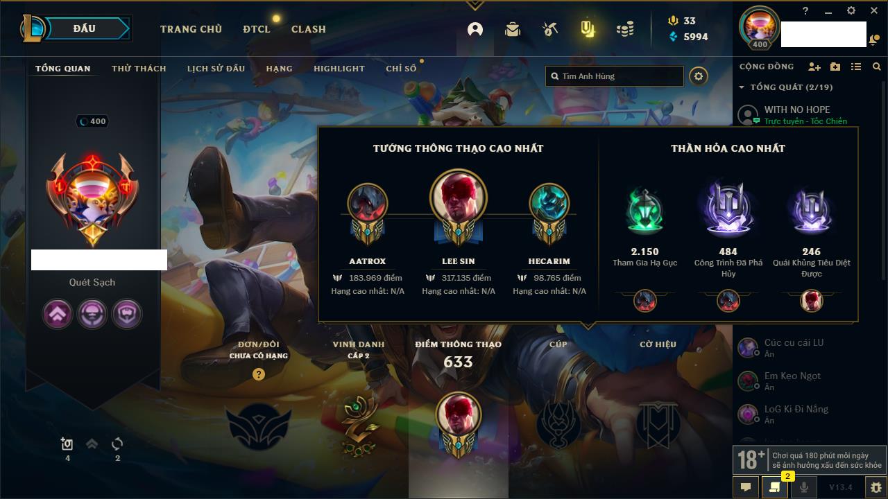Rank Đơn: Bạch Kim IIIKhung: Bạch kimTướng: 171 - Còn 251383 THXTrang Phục: 229Rank ĐTCL: Sắt IILinh Thú: 51