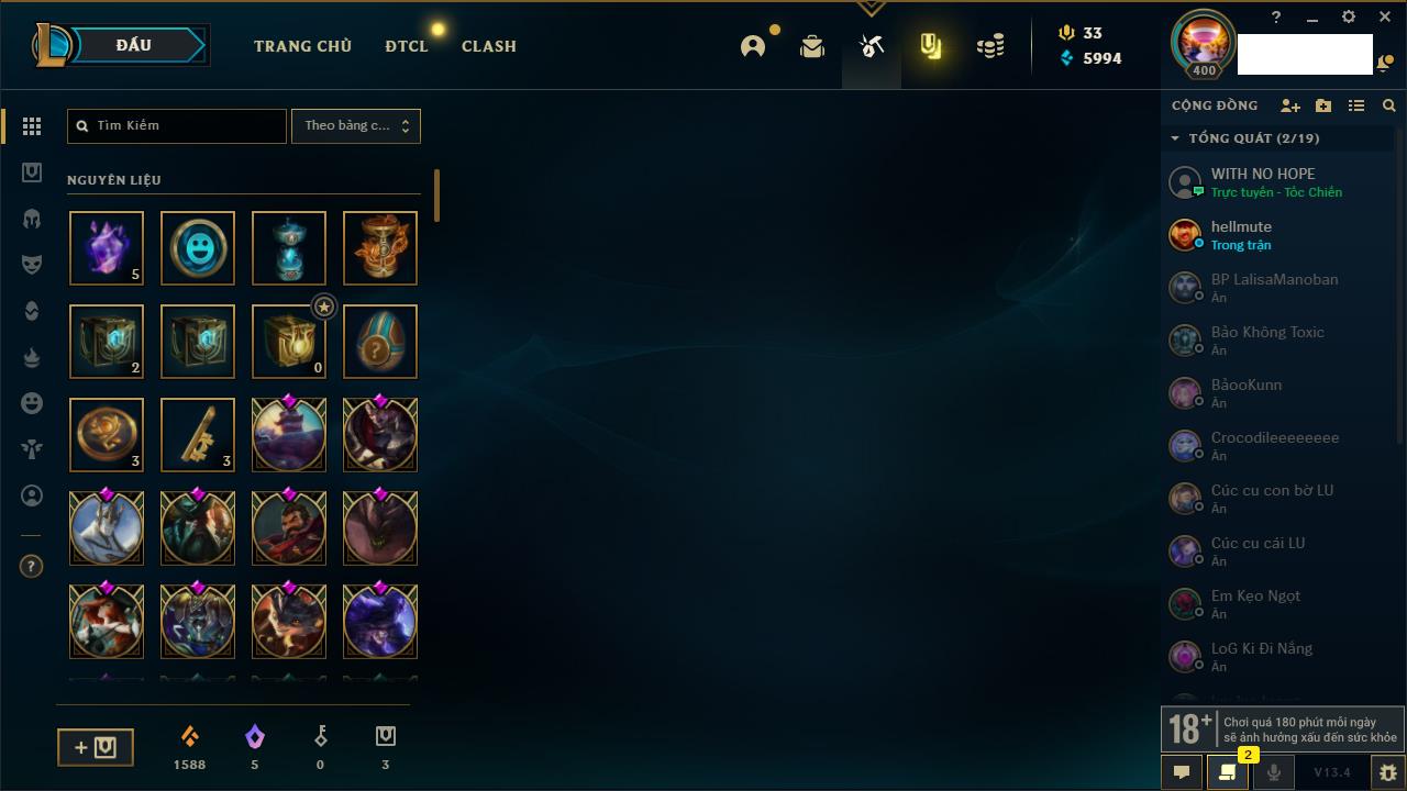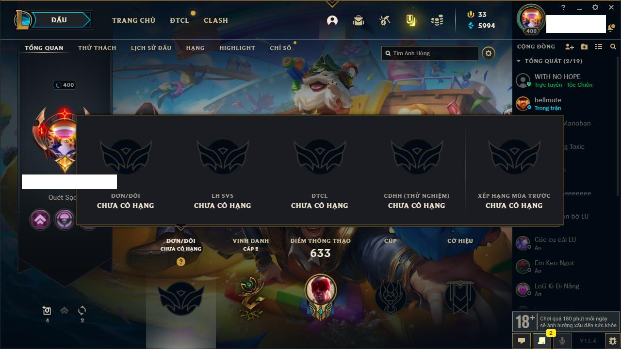 Rank Đơn: Vàng IKhung: BạcTướng: 171 - Còn 60584 THXTrang Phục: 286Rank ĐTCL: Vàng IIILinh Thú: 117