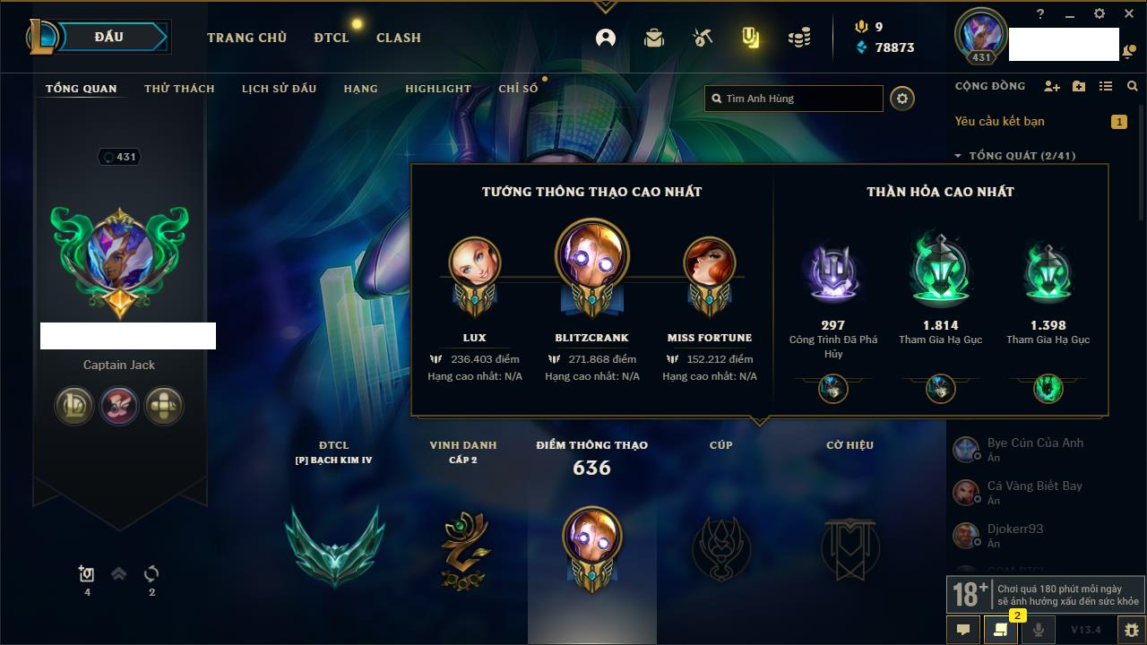 Rank Đơn: Bạch Kim IKhung: Bạch kimTướng: 171 - Còn 131918 THXTrang Phục: 297Rank ĐTCL: Chưa RankLinh Thú: 118