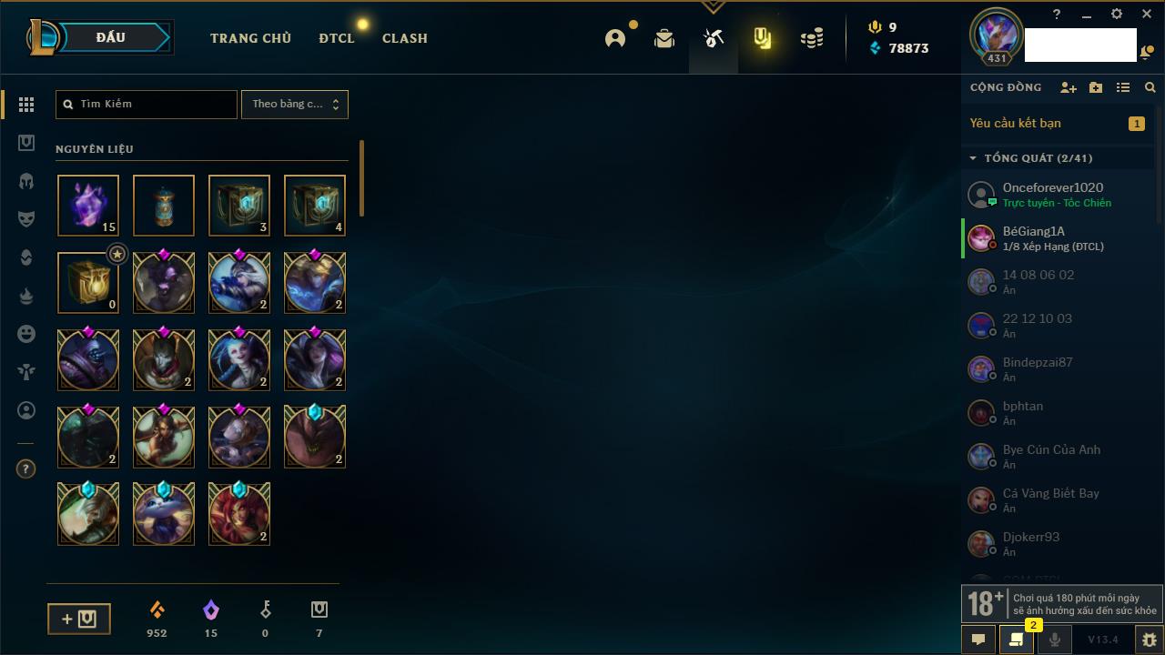 Rank Đơn: Vàng IIIKhung: VàngTướng: 171 - Còn 88128 THXTrang Phục: 329Rank ĐTCL: Chưa RankLinh Thú: 41