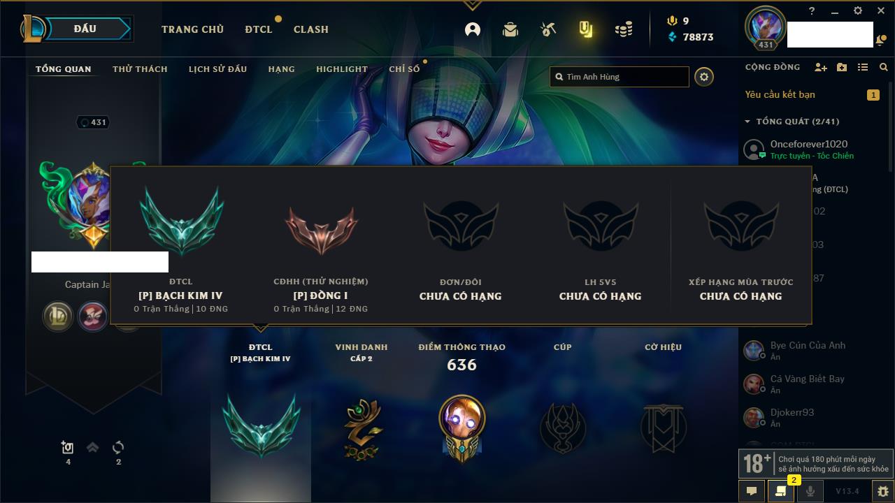 Rank Đơn: Đồng IIKhung: ĐồngTướng: 171 - Còn 83342 THXTrang Phục: 94Rank ĐTCL: Bạch Kim IVLinh Thú: 161