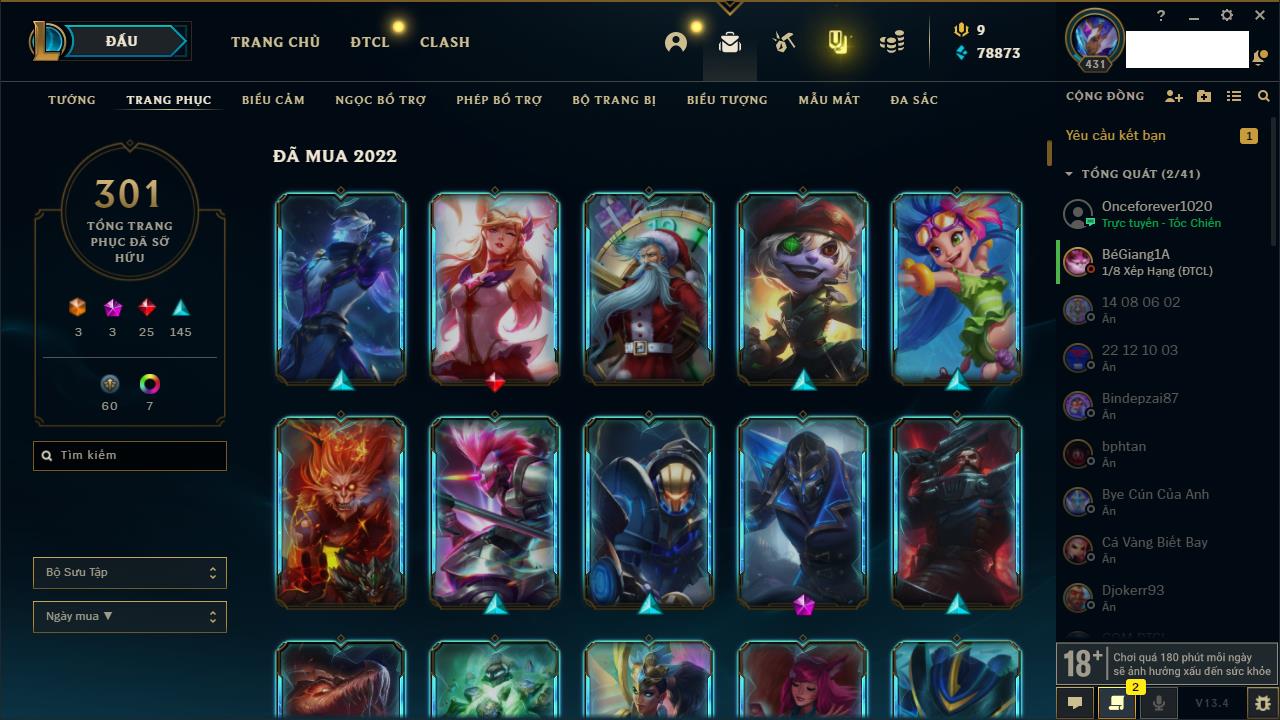 Rank Đơn: Vàng IKhung: BạcTướng: 171 - Còn 60584 THXTrang Phục: 286Rank ĐTCL: Vàng IIILinh Thú: 117