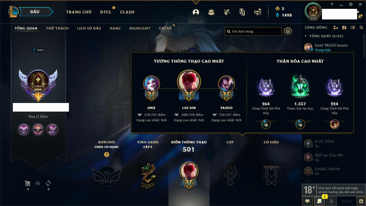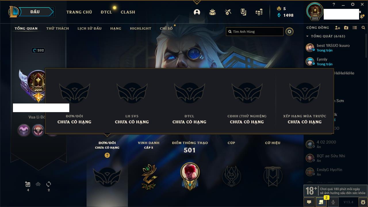Rank Đơn: Vàng IKhung: BạcTướng: 171 - Còn 60584 THXTrang Phục: 286Rank ĐTCL: Vàng IIILinh Thú: 117