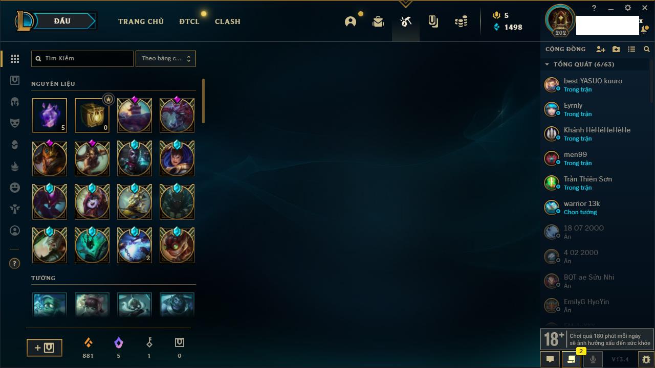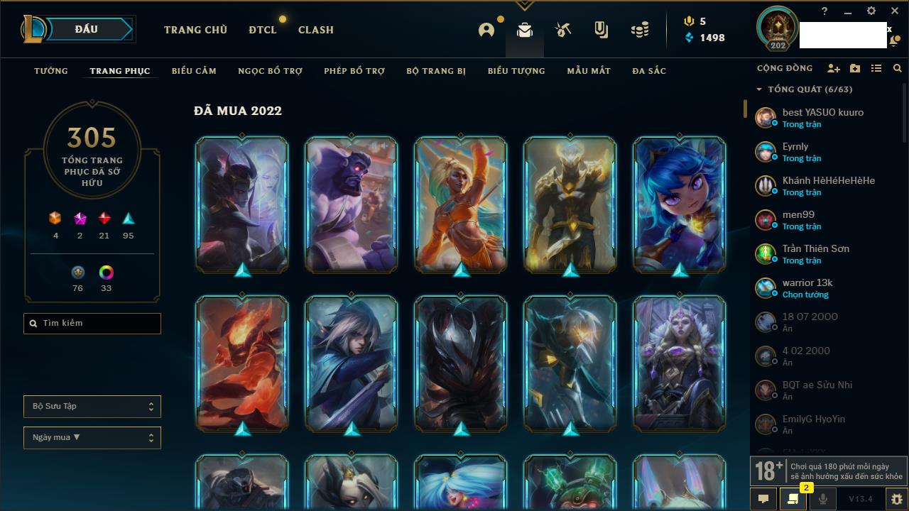 Rank Đơn: Vàng IIIKhung: VàngTướng: 171 - Còn 88128 THXTrang Phục: 329Rank ĐTCL: Chưa RankLinh Thú: 41
